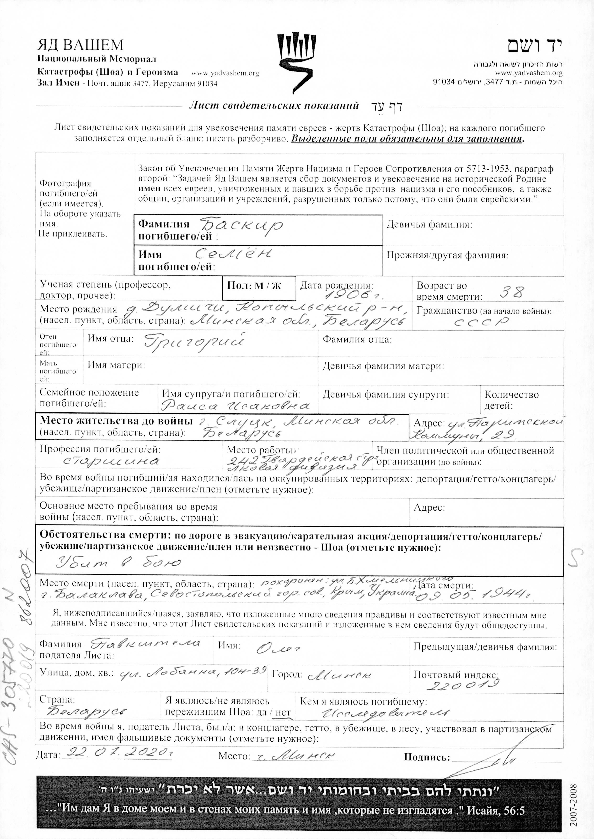 Semyon Baskir was born in Dumichi, Belorussia (USSR), 1906. Prior to WWII he lived in Slutsk, Belorussia (USSR).