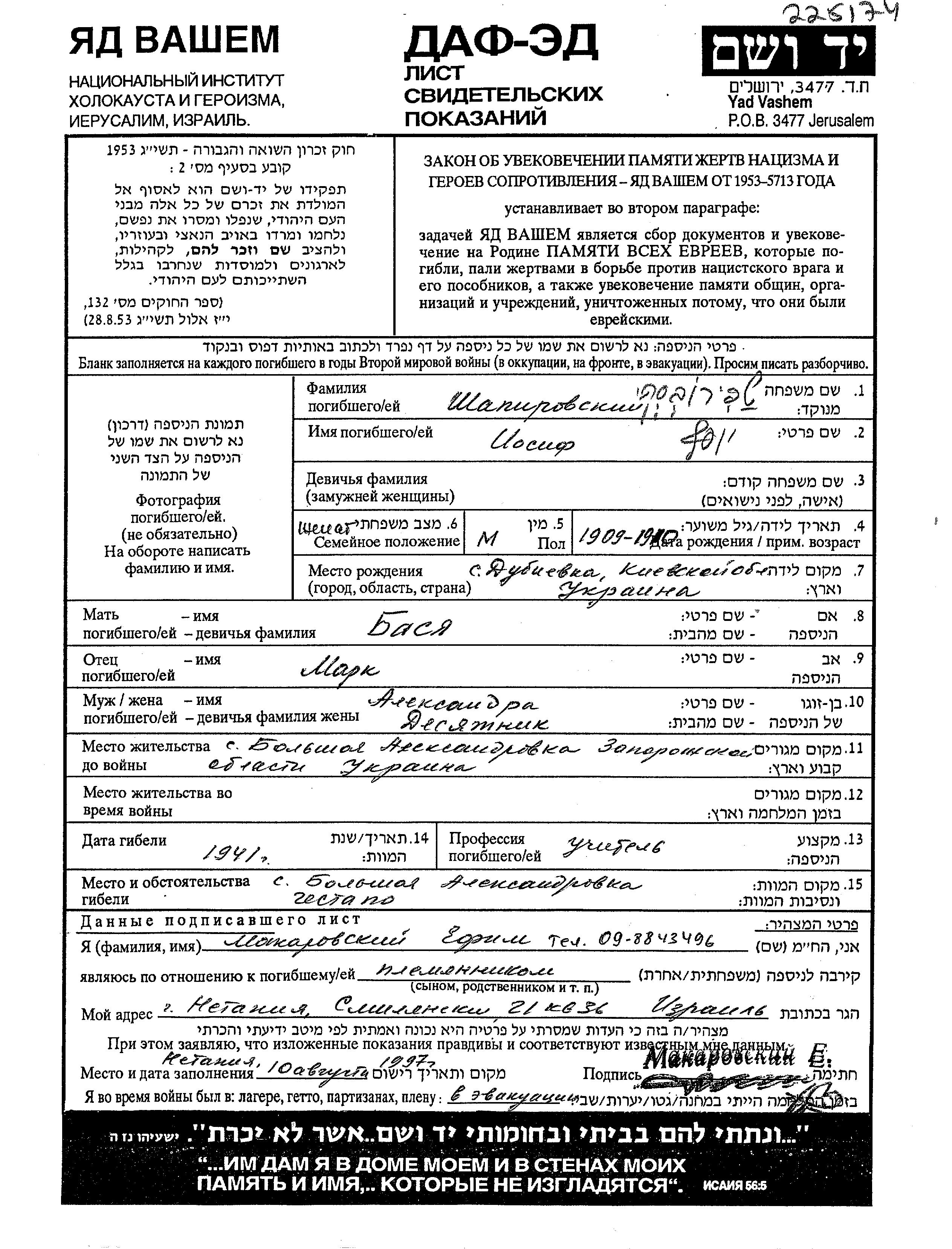 Iosif Shapirovski was born in Dubiyevka, Ukraine (USSR), 1909 to Mark and Basya. He was a teacher and married to Aleksandra. Prior to WWII he lived in Bolshaya Aleksandrovka, Ukraine (USSR). Iosif was murdered in the Shoah. Place of death: Bolshaya Aleksandrovka, Ukraine (USSR), 1941.