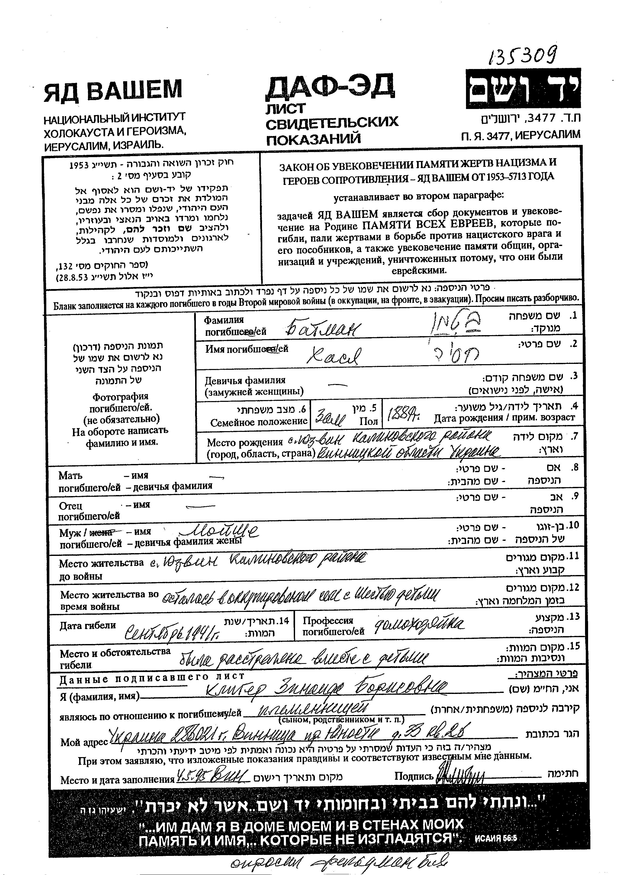 Khasia Batman was born in Yuzvin, Ukraine (USSR), 1889. She was a housewife and married to Moishe. Prior to WWII she lived in Yuzvin, Ukraine (USSR). During the war she was in Yuzvin, Ukraine (USSR). Khasia was murdered in the Shoah. Place of death: unknown, 1941.