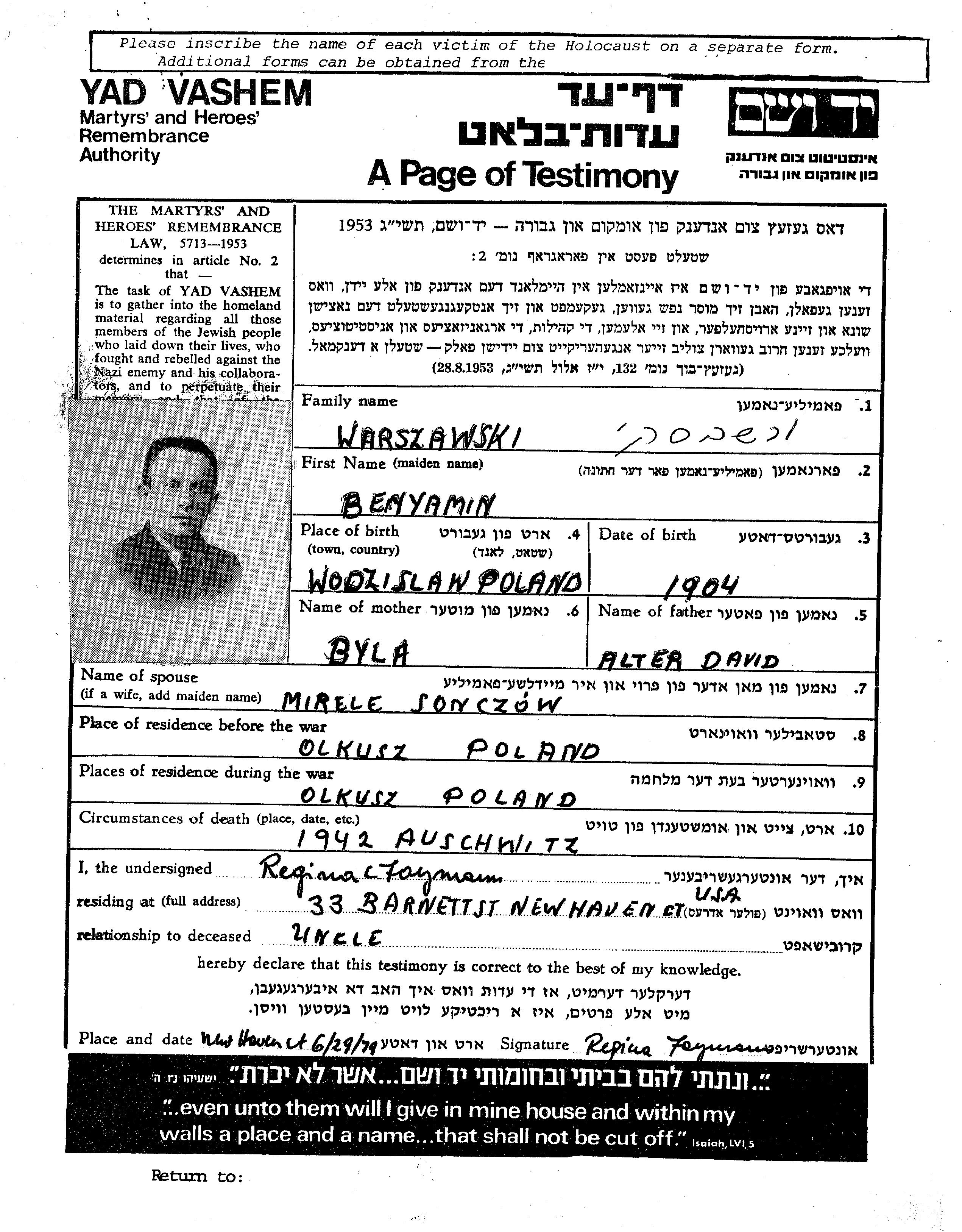 Warszawski | Benyamin | 1904 | Olkusz, Poland | Page of Testimony |