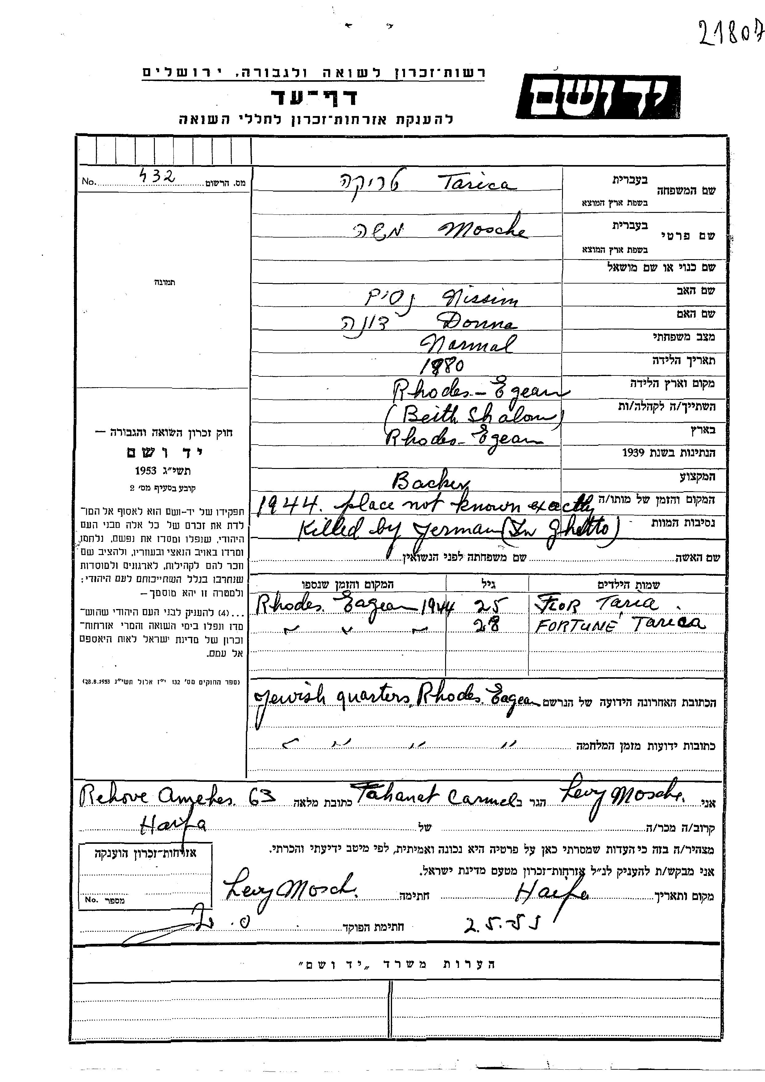 Mosche Tarica was born in Rodi, Italy, 1880 to Nissim and Donna. He was a butcher and married. Prior to WWII he lived in Rodi, Italy. During the war he was in Rodi, Italy. Mosche was murdered in the Shoah. Place of death: Ghetto, 1944.