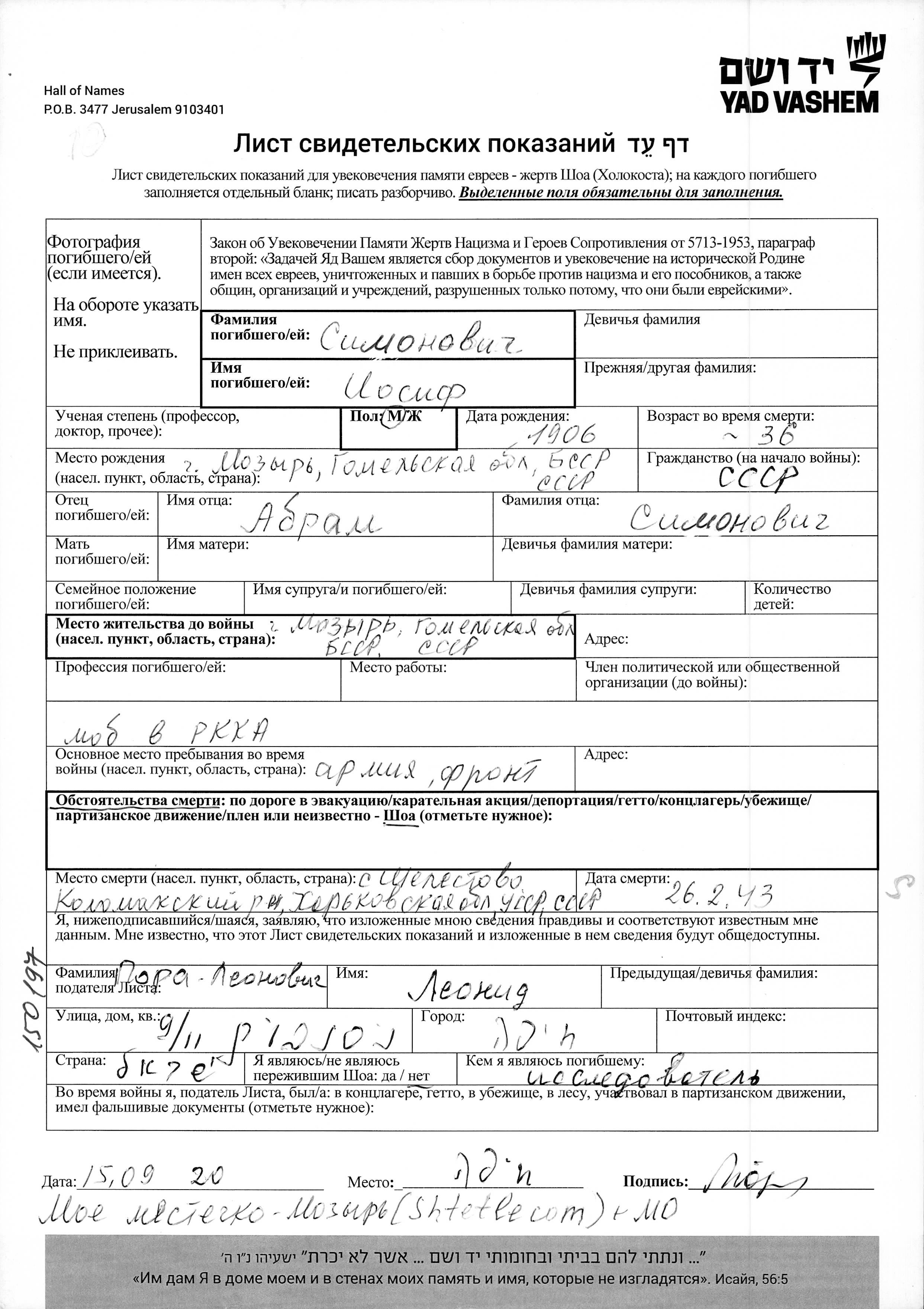 Iosif Simonovich was born in Mozyr, Belorussia (USSR) to Abram. Prior to WWII he lived in Mozyr, Belorussia (USSR). During the war he was in Mozyr, Belorussia (USSR). Iosif was killed in military service in WWII. Place of death: Kolomak, Ukraine (USSR), 26/02/1943.