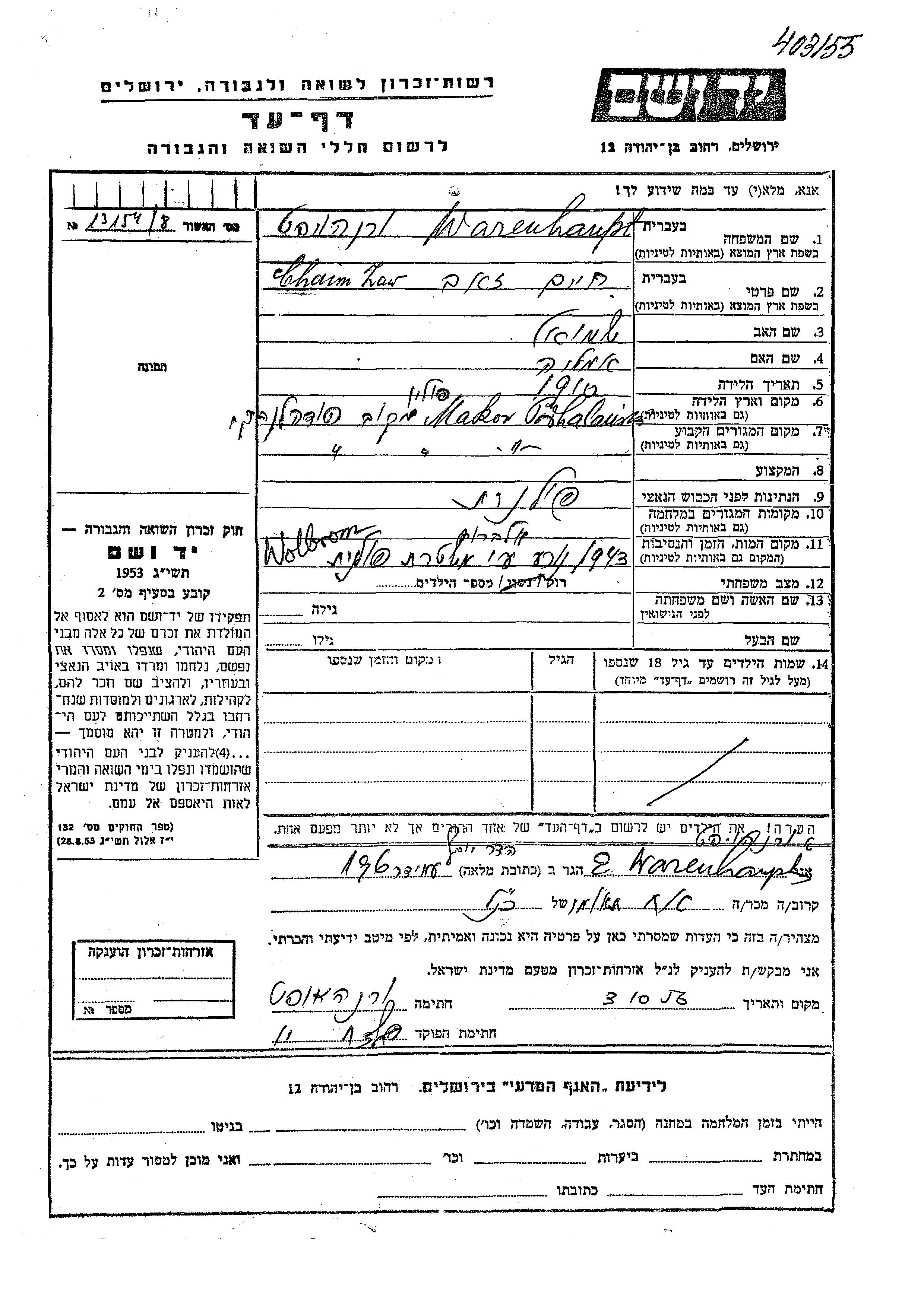 Chaim Zaw Warenhaupt was born in Maków, Poland, 1910 to Shmuel and Amalia. He was married. Prior to WWII he lived in Maków, Poland. During the war he was in Wolbrom, Poland. Chaim Zaw was murdered in the Shoah. Place of death: Wolbrom, Poland, 1943.