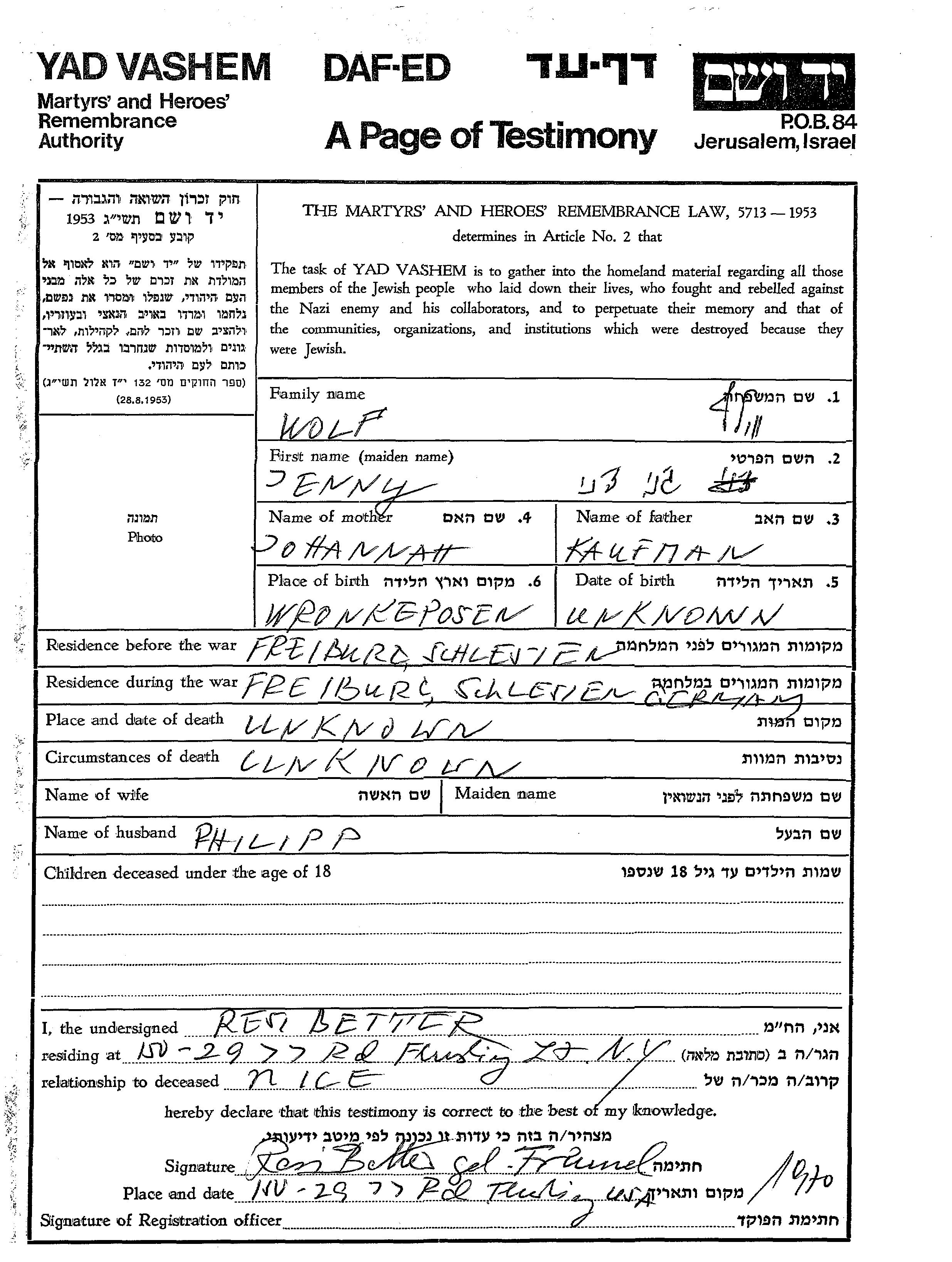 Jenny Wolf was born in Wronki, Poland to Kaufman and Johannah. She was married to Phillip. Prior to WWII she lived in Freiburg, Germany. During the war she was in Freiburg, Germany. Jenny was murdered in the Shoah.