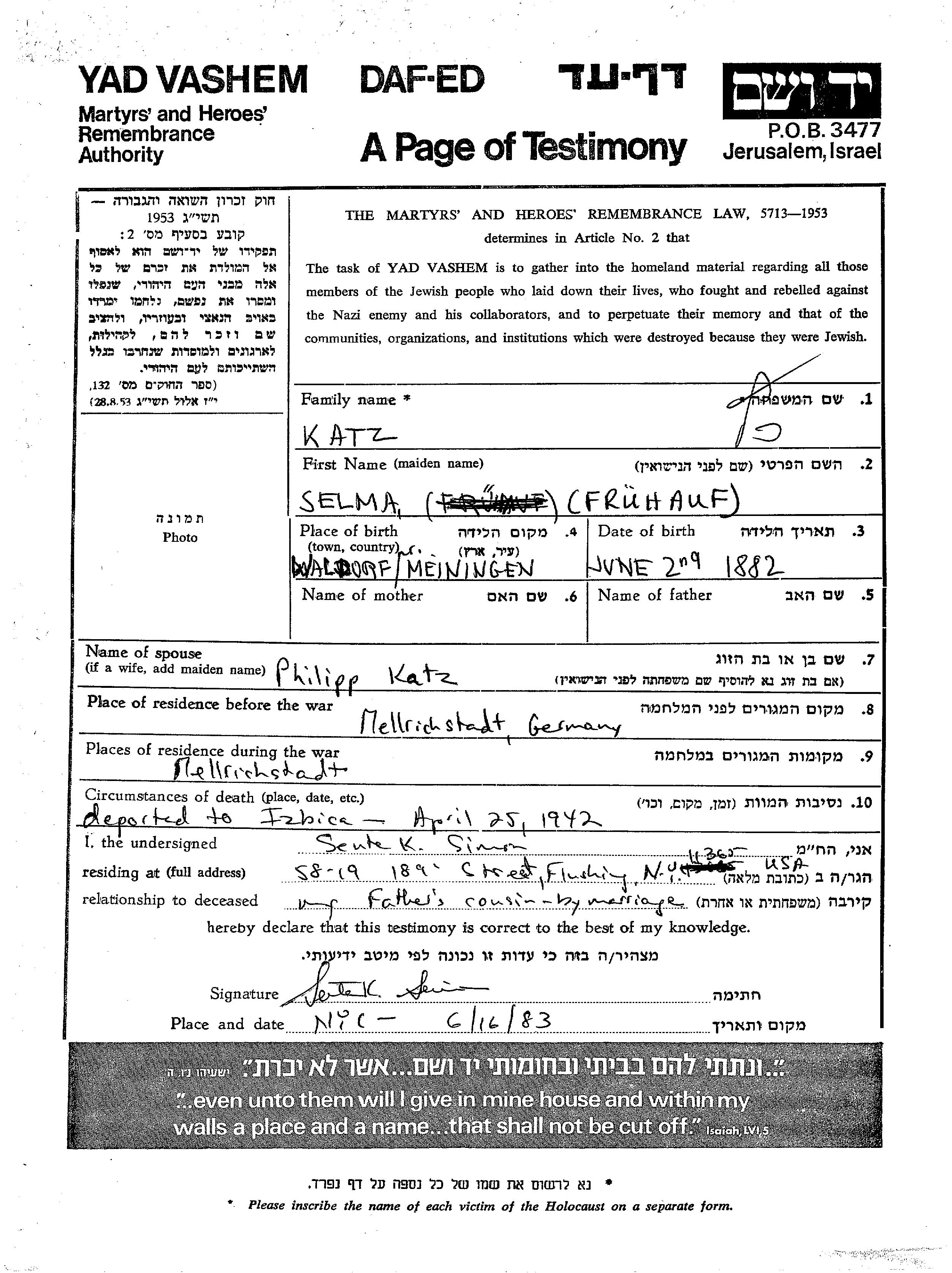Selma Katz nee Fruehauf was born in Waldorf, Germany, 1882. Prior to WWII she lived in Mellrichstadt, Germany. During the war she was in Mellrichstadt, Germany. Selma was murdered in the Shoah. Place of death: Izbica, Poland, 25/04/1942.