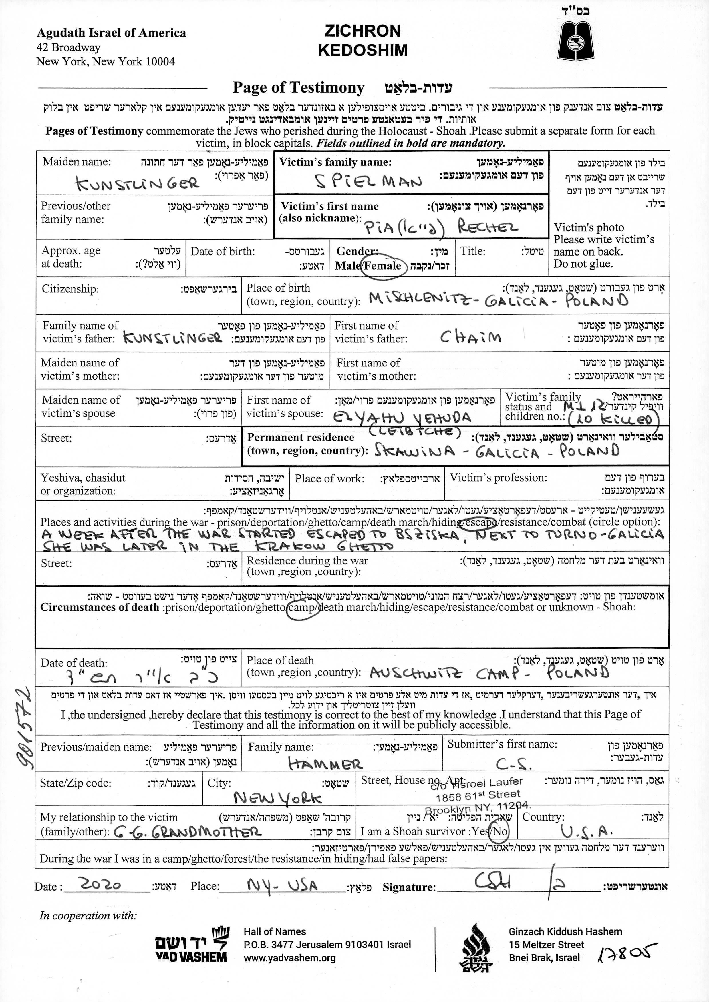 Pia Rechel Spielman nee Kunstlinger was born in Myszyniec, Poland to Chaim. She was married to Elyahu Yehuda Leibtche. Prior to WWII she lived in Skawina, Poland. During the war she was in Auschwitz, Poland. Pia Rechel was murdered in the Shoah. Place of death: Auschwitz, Poland, 15/05/1944.