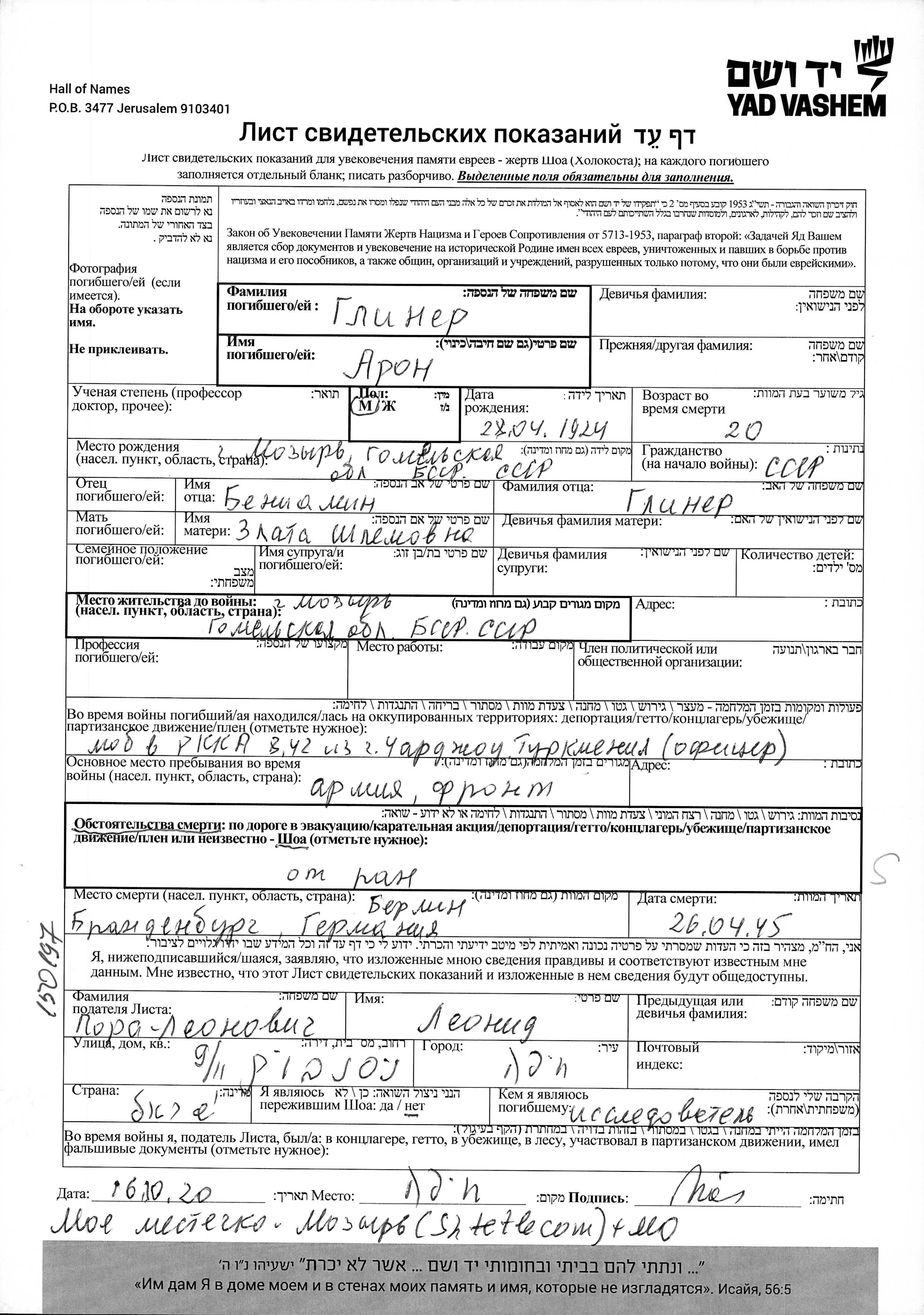 Gliner Aron Mozyr, Belorussia (USSR) Page of Testimony