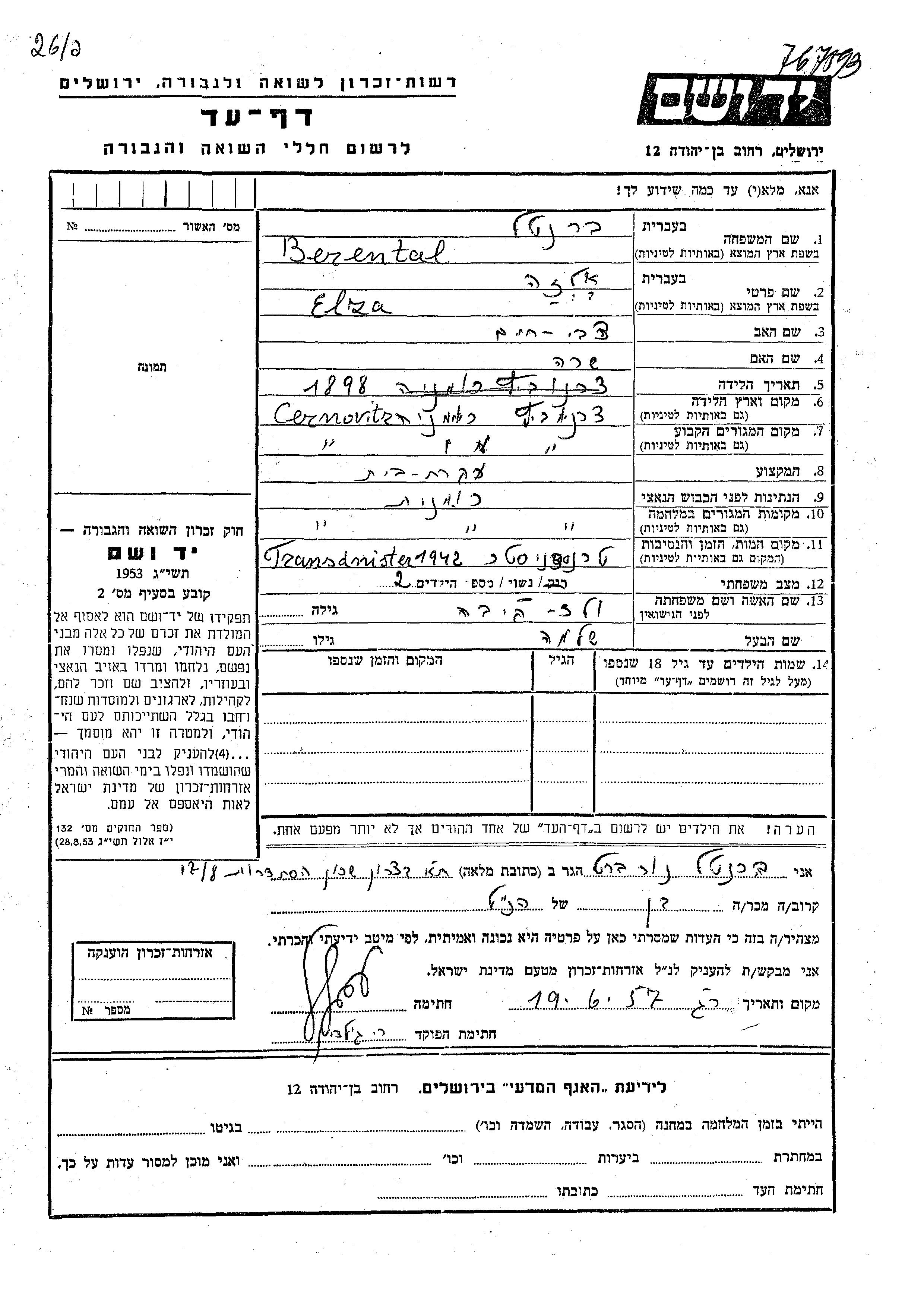 | Berental | Elza | 1898 | Czernowitz, Romania | Page of Testimony |