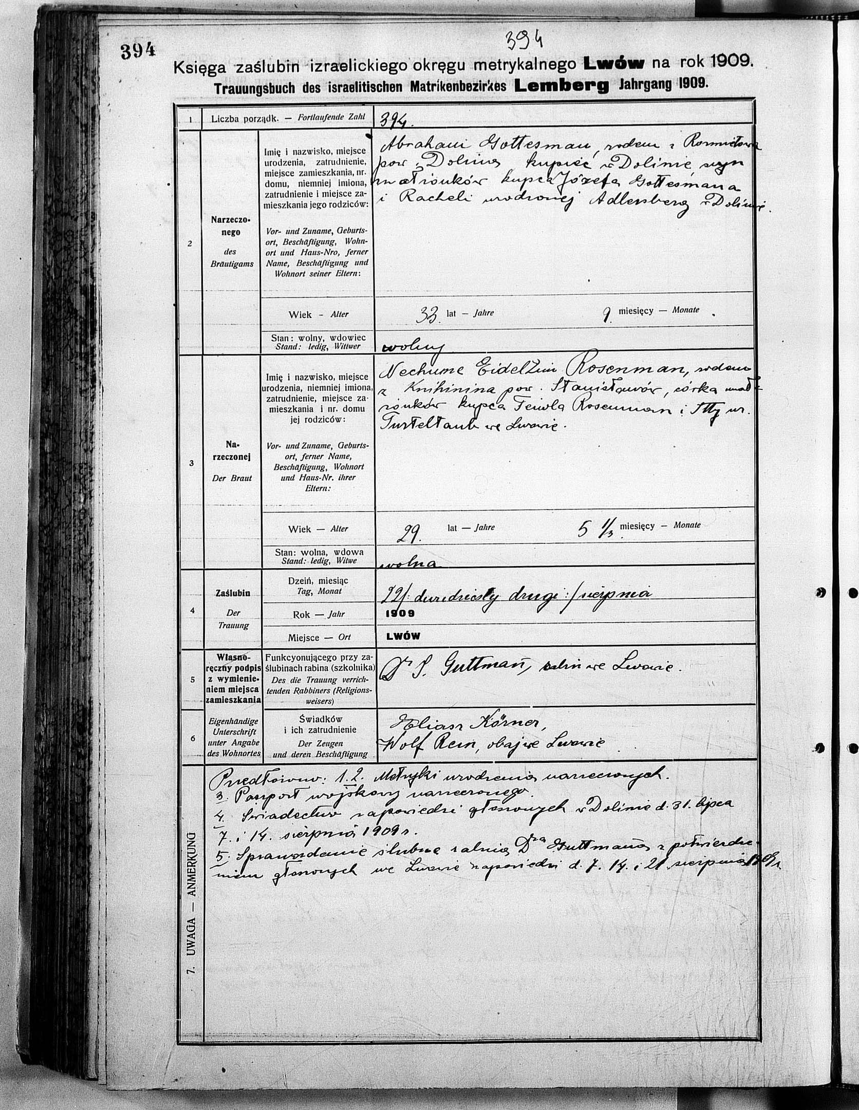 Gottesman Rosenman Nechume Eideli Lwow, Poland Marriage certificate