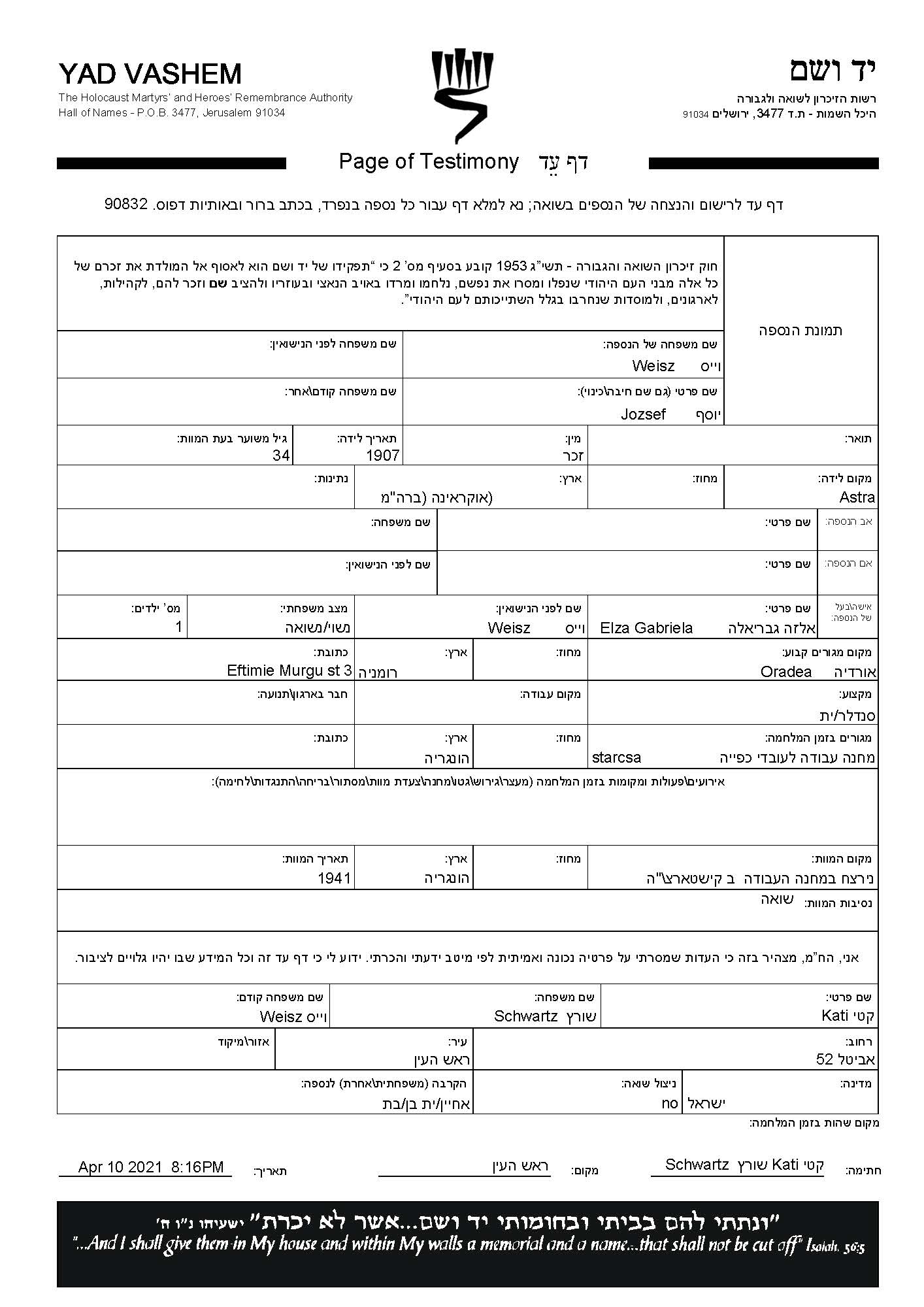 Weisz Jozsef 1907 Oradea, Romania Page of Testimony (digital)