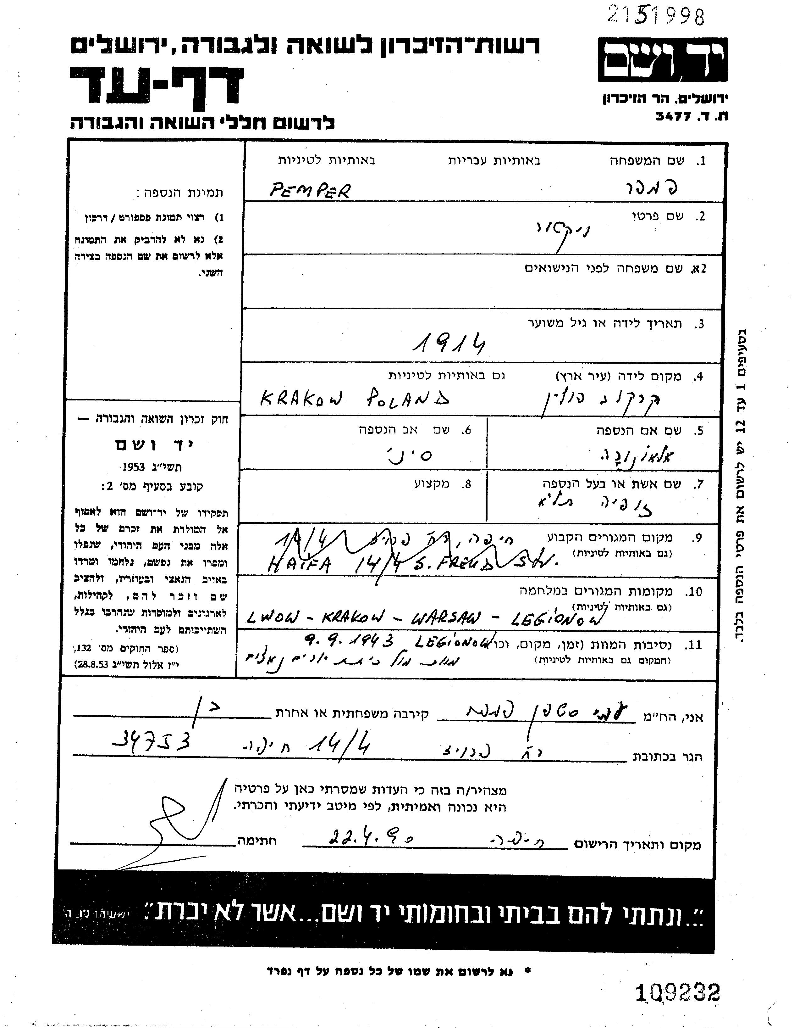 Viktor Pemper was born in Krakow, Poland, 1914. He was a merchant. Prior to WWII he lived in Krakow, Poland. Viktor was murdered in the Shoah. Place of death: Legionowo, Poland, 09/09/1943.