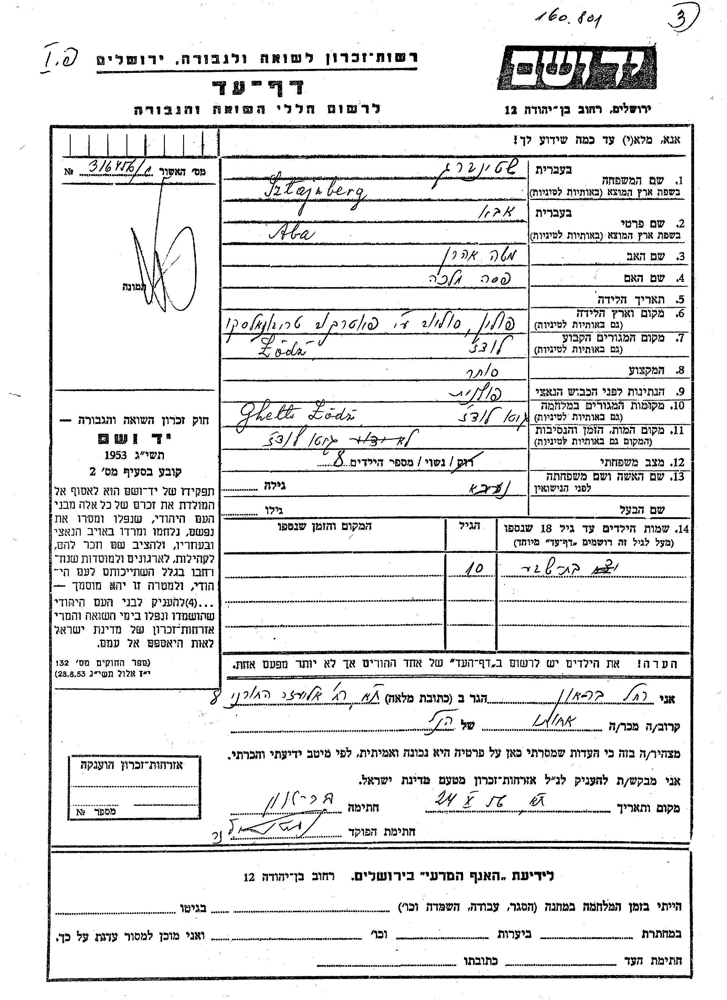 Shteinberg Aba Lodz, Poland Page of Testimony