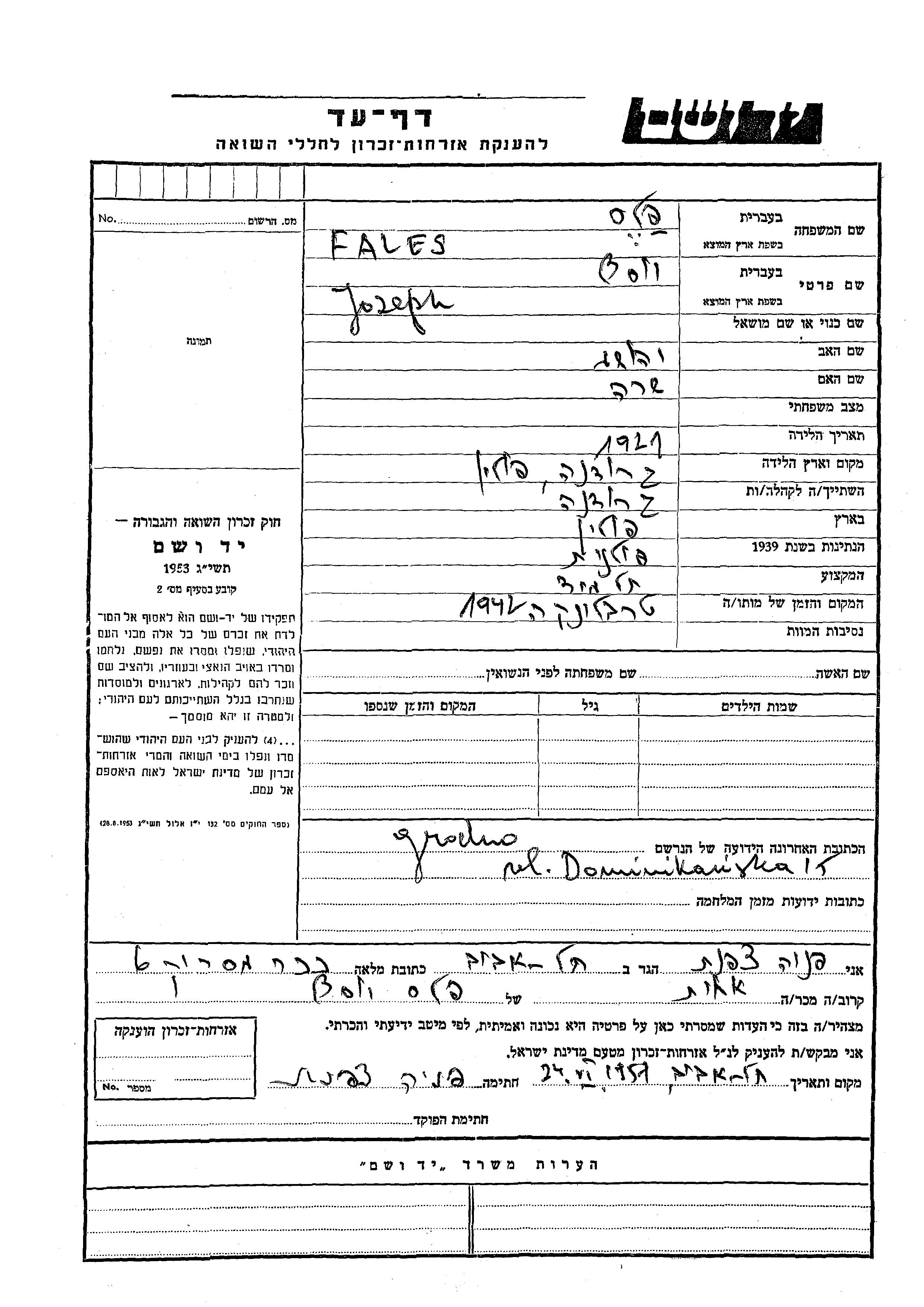 Fales Jozeph 1921 Grodno, Poland Page of Testimony