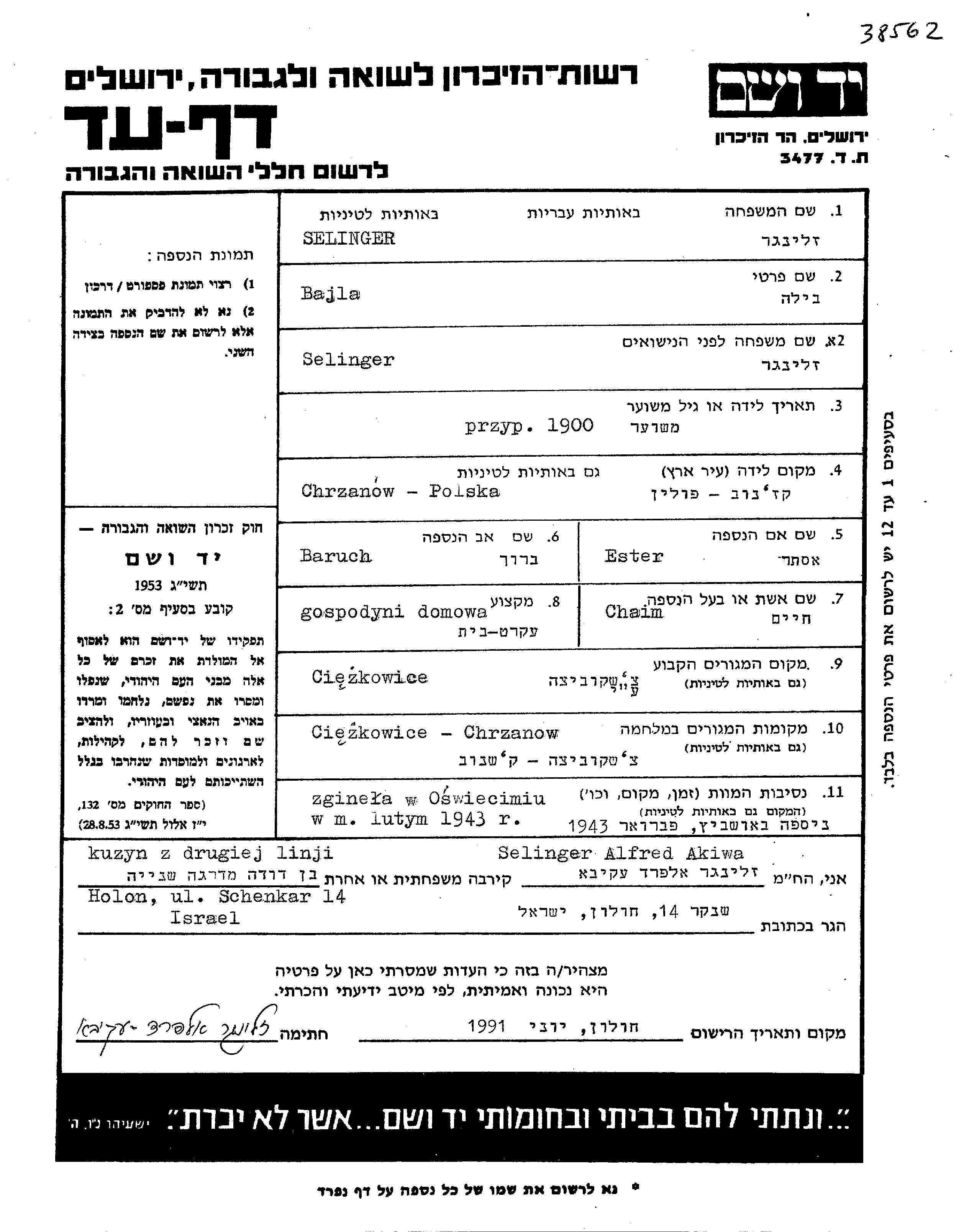 Bajla Selinger nee Selinger was born in Chrzanow, Poland, 1900. She was a housewife. Prior to WWII she lived in Ciezkowice, Poland. Bajla was murdered in the Shoah. Place of death: Auschwitz, Poland, 1943.