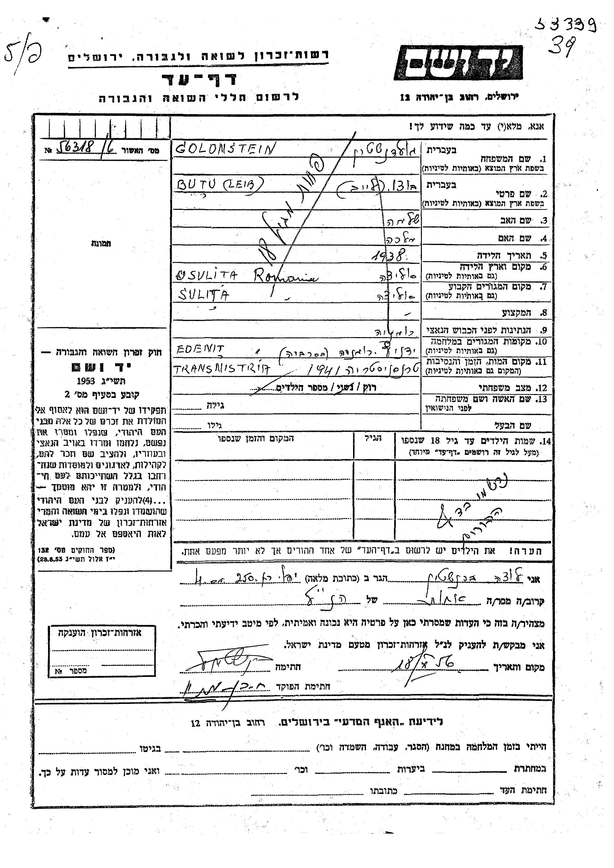 Goldnstein Butu Leib 1938 Sulita, Romania Page of Testimony