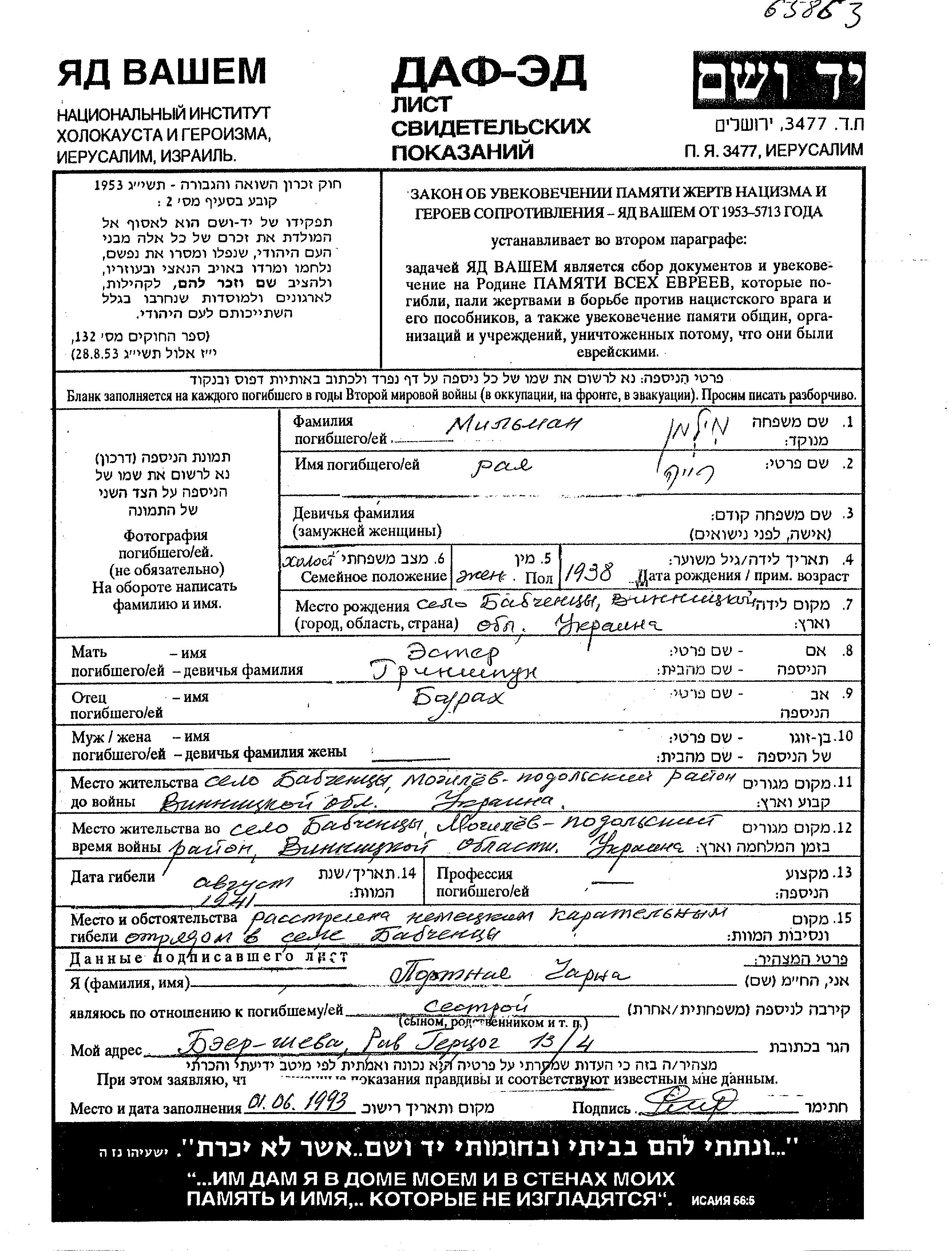 Raia Milman was born in Babchintsy, Ukraine (USSR), 1938. Prior to WWII she lived in Babchintsy, Ukraine (USSR). Raia was murdered in the Shoah. Place of death: Babchintsy, Ukraine (USSR), 1941.