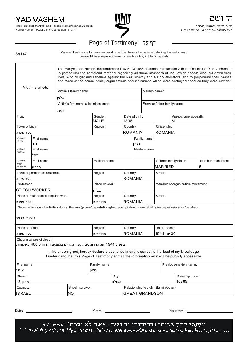 Volk Gelman was born in Pepeni, Romania, 1898. He was an uppers cutter/tailor. Prior to WWII he lived in Pepeni, Romania. Volk was murdered in the Shoah. Place of death: unstated place, 1941.