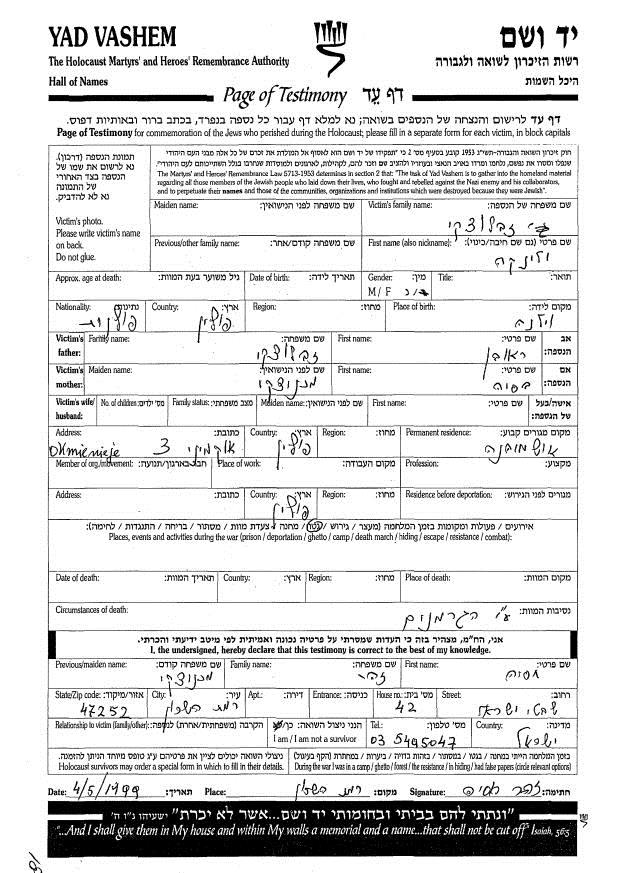 Yad Vashem - Pages of Testimony Names Memorial Collection