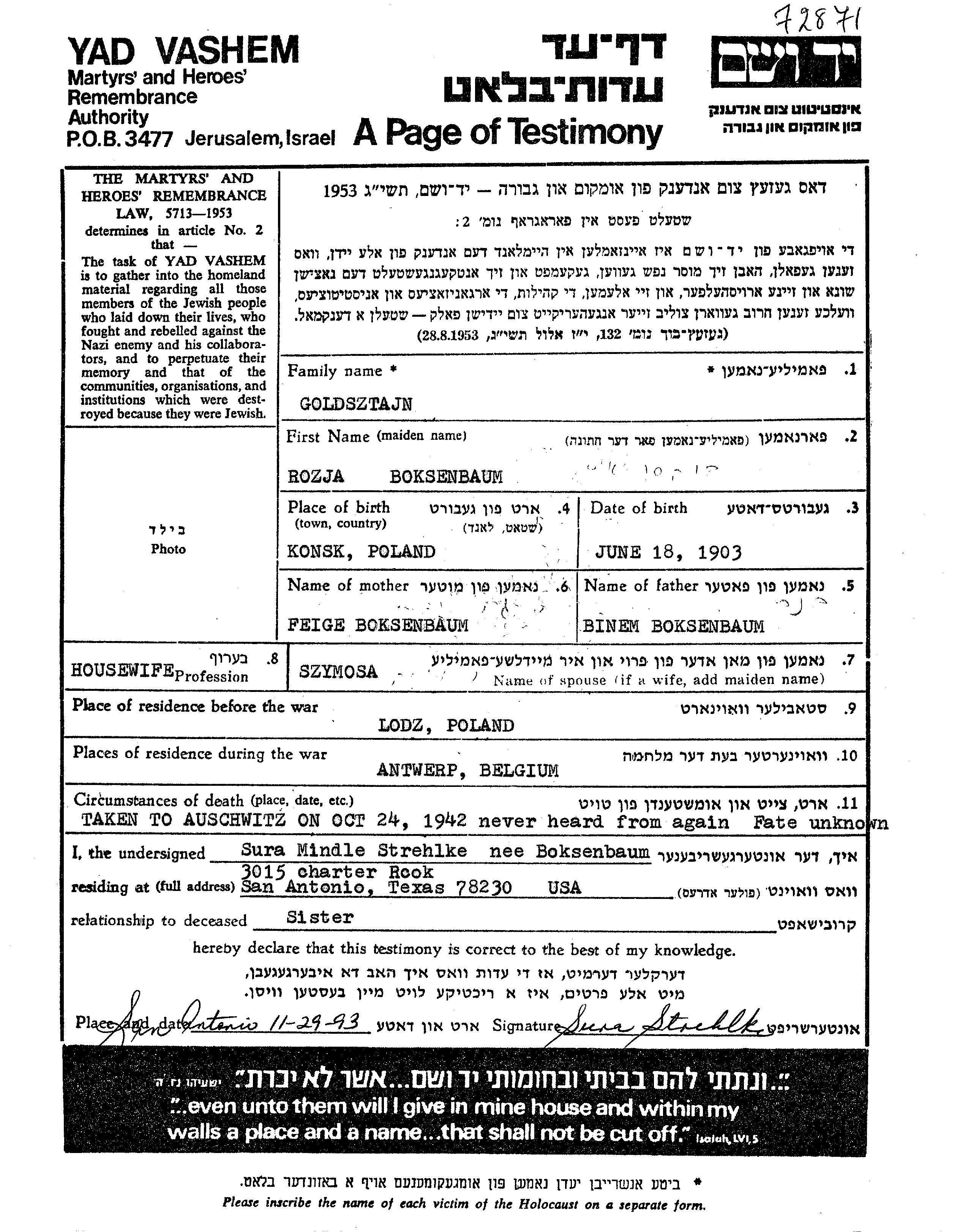 Goldsztajn | Rozja | 1903 | Lodz, Poland | Page of Testimony |