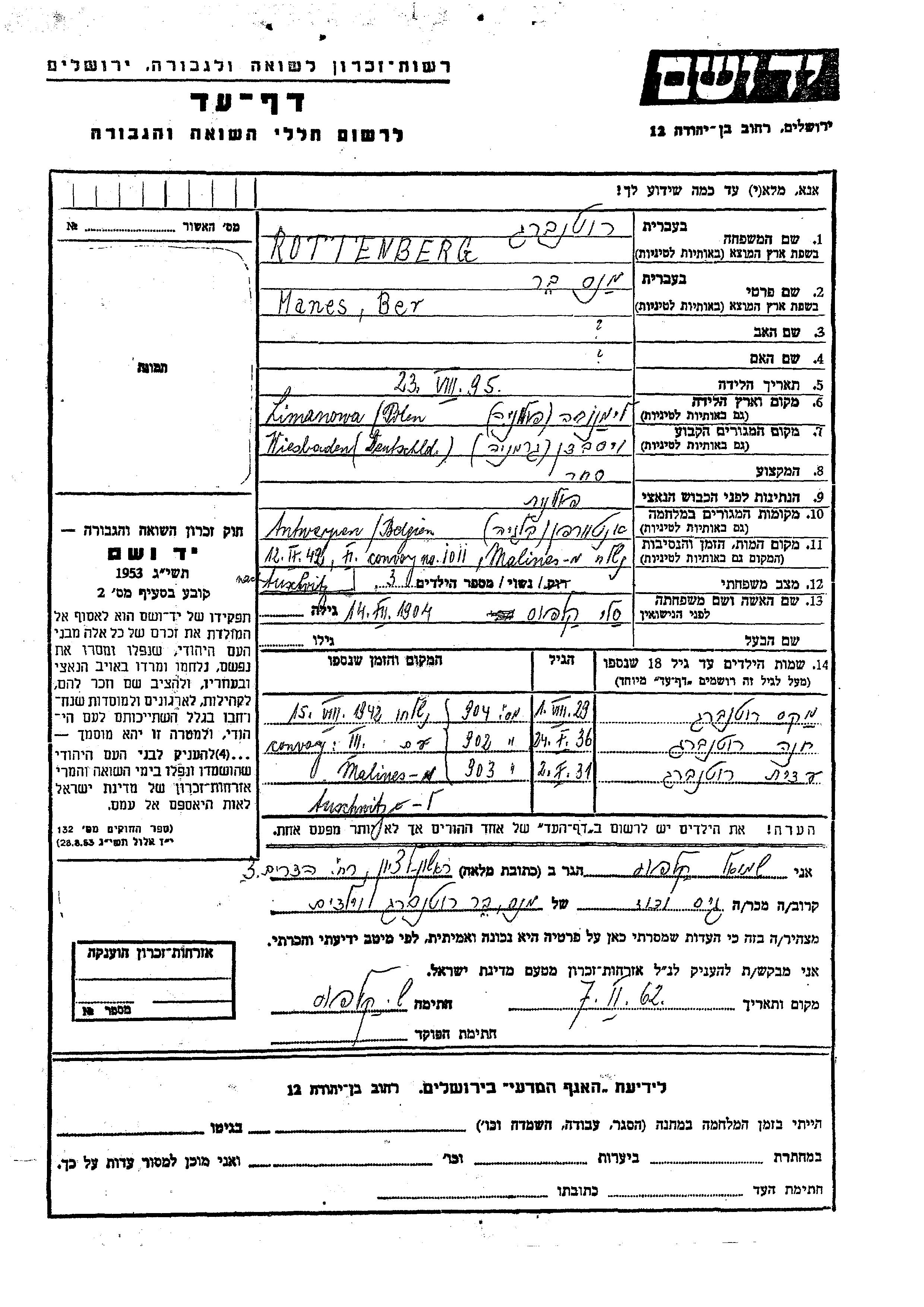 Rottenberg Khana 1936 Wiesbaden, Germany Page of Testimony