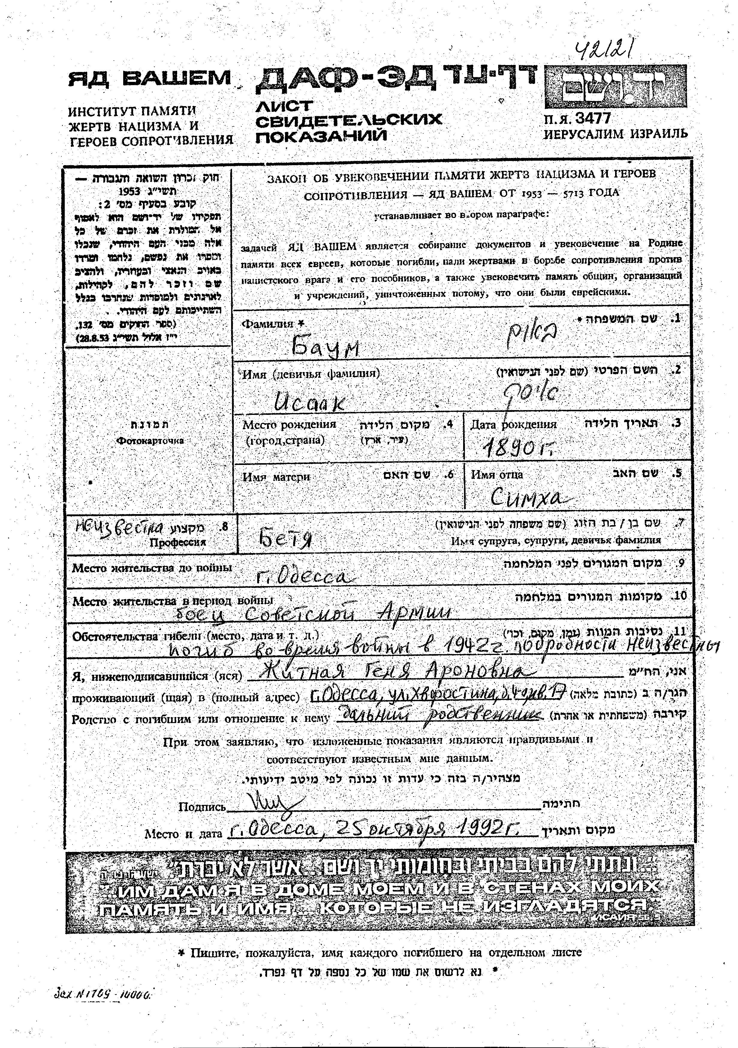 Baum Isaak 1890 Odessa, Ukraine (USSR) Page of Testimony
