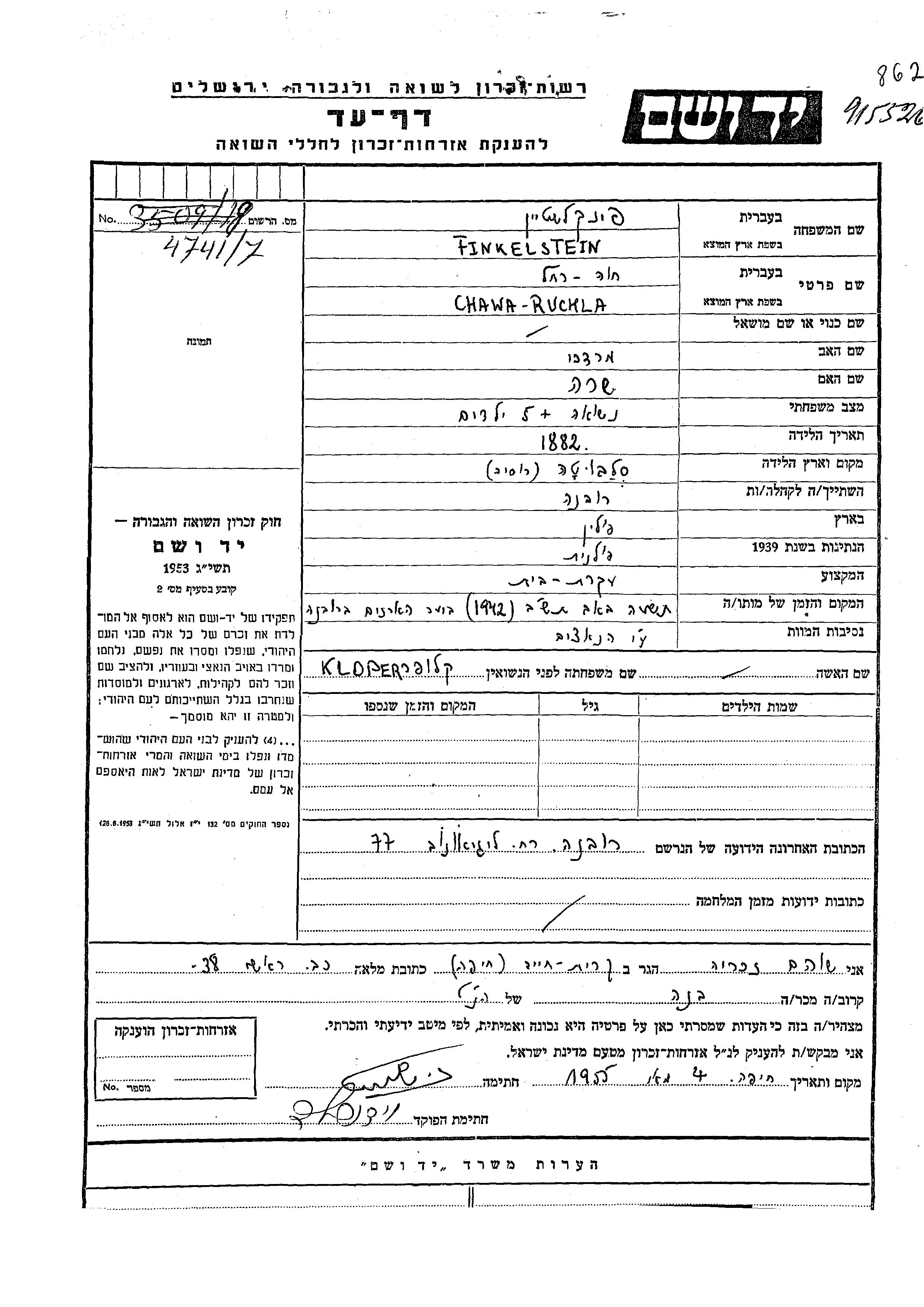 Chawa Ruchla Finkelstein was born in Slavuta, Ukraine (USSR), 1882 to Mordekhai and Sara. She was a housewife. During the war she was in Rowno, Poland.