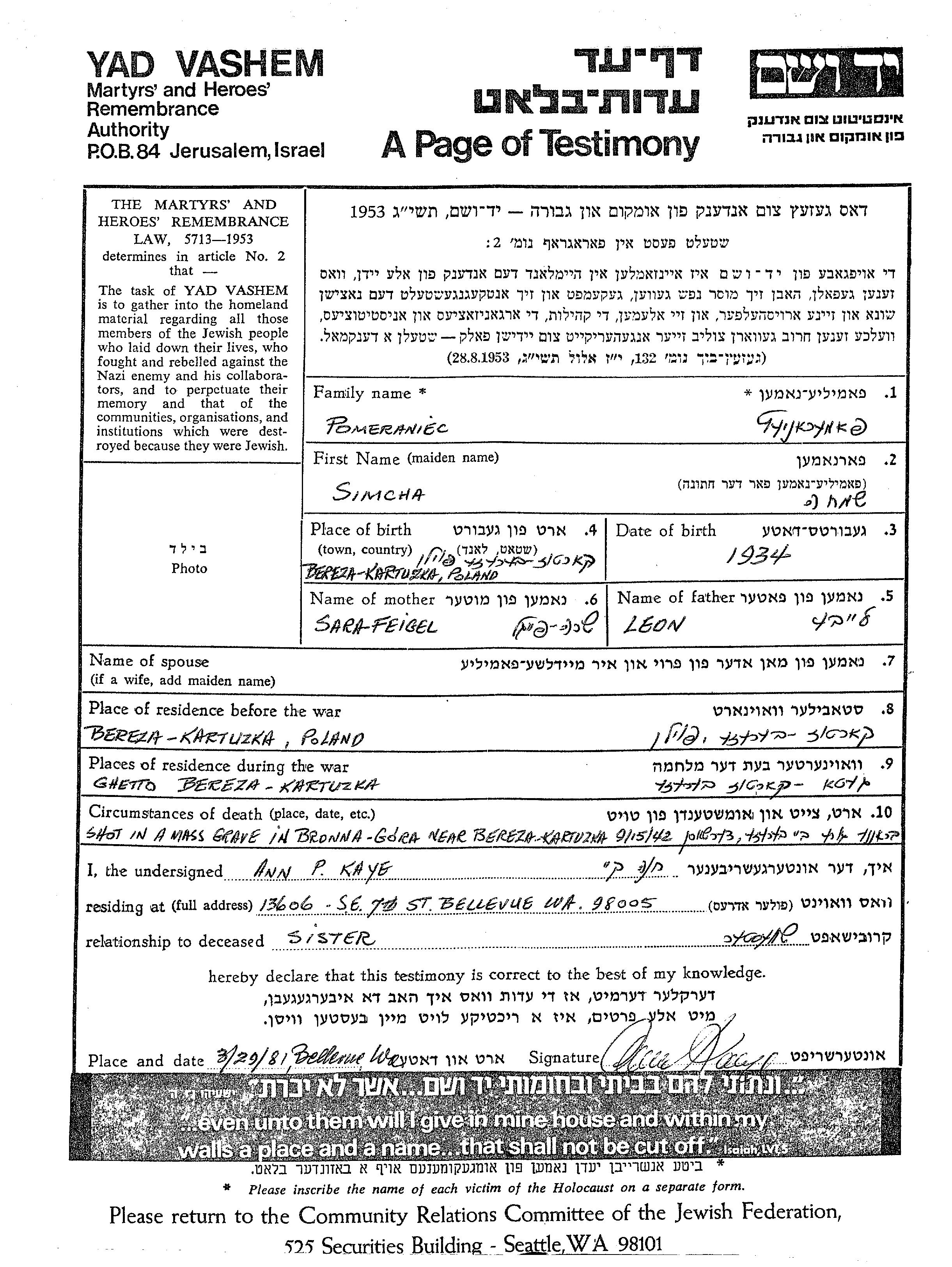 Pomeraniec Simcha 1934 Bereza Kartuska, Poland Page of Testimony