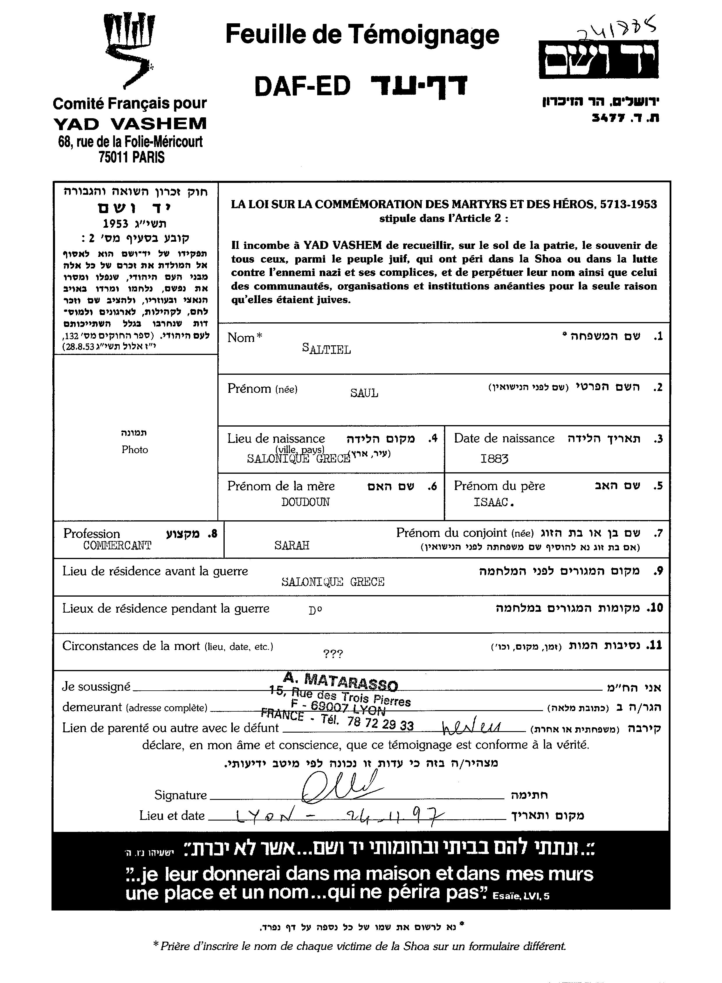 Shaul Shaltiel was born in Saloniki, Greece, 1883. He was a merchant. Prior to WWII he lived in Thessaloniki, Greece.