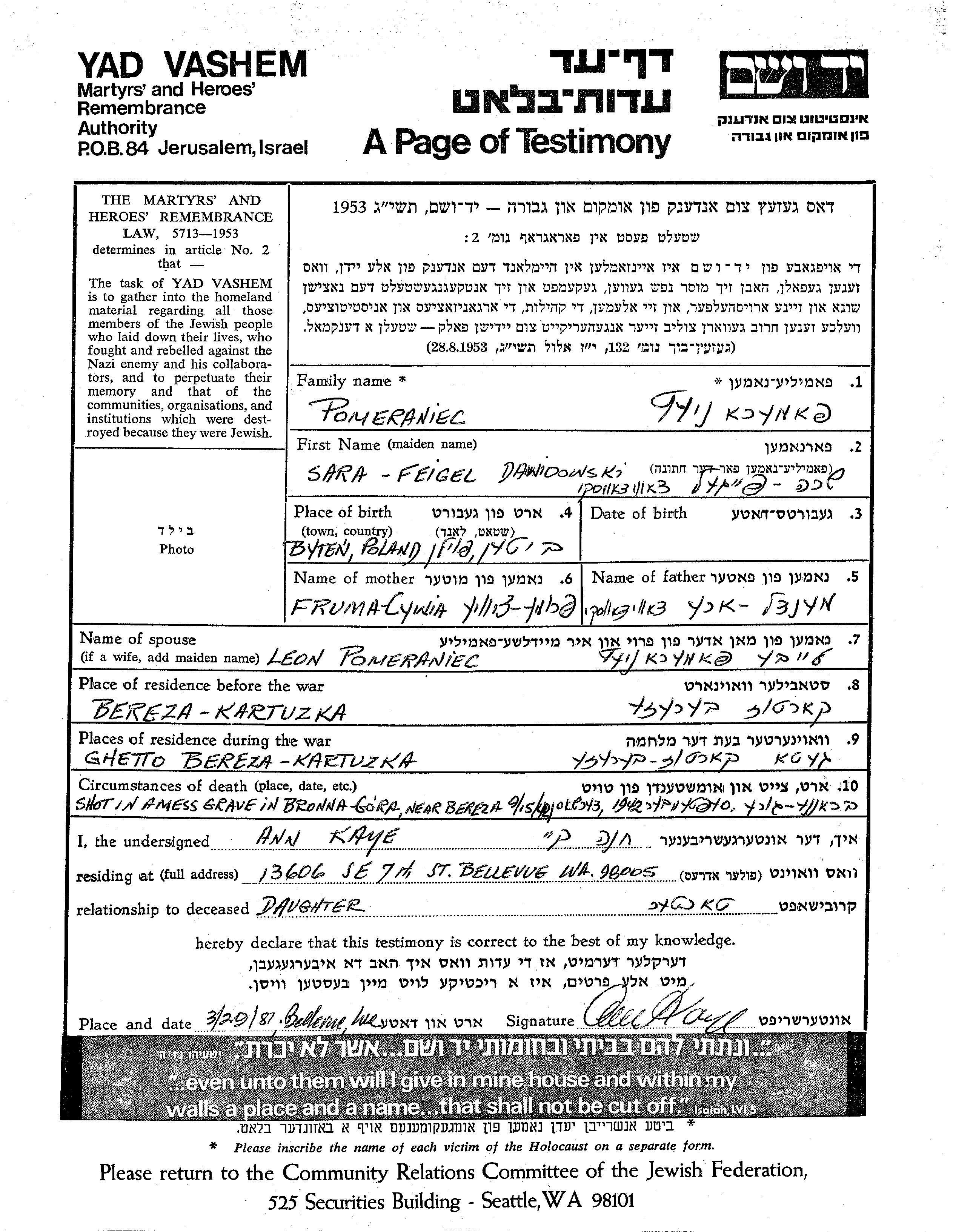 Pomeraniec Feigel Sara Bereza Kartuska, Poland Page of Testimony
