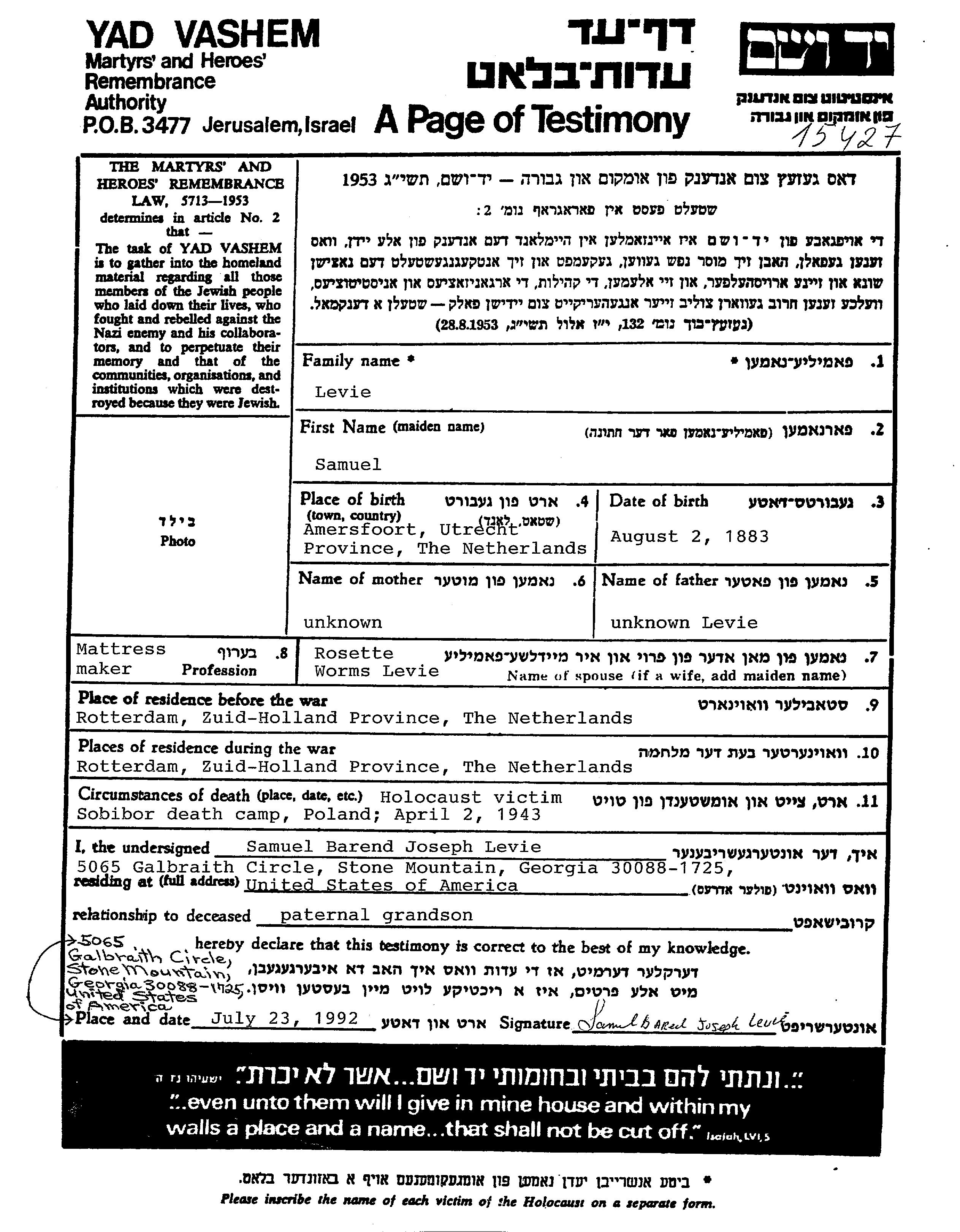 | Levie | Samuel | 1883 | Rotterdam, The Netherlands | Page of Testimony |