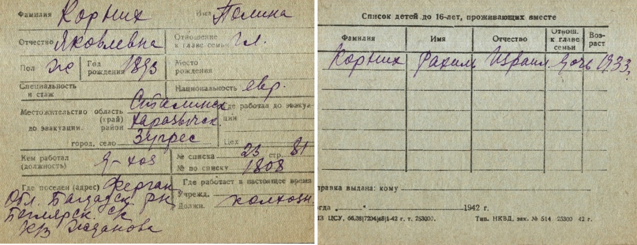 Polina Kornikh Kurnik nee Sheshilovskaya was born in Troitsko-Safonovo, Ukraine (USSR), 1893. She was a housewife. Prior to WWII she lived in Zugres, Ukraine (USSR). Polina was registered following the evacuation/ in the interior of the Soviet Union.