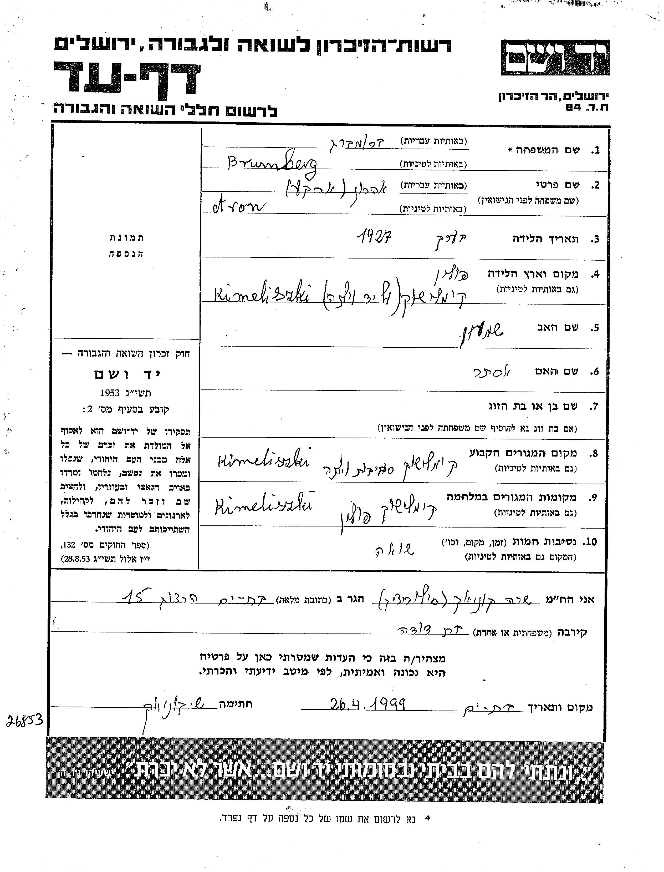 Brumberg Aron 1927 Kimeliszki, Poland Page of Testimony