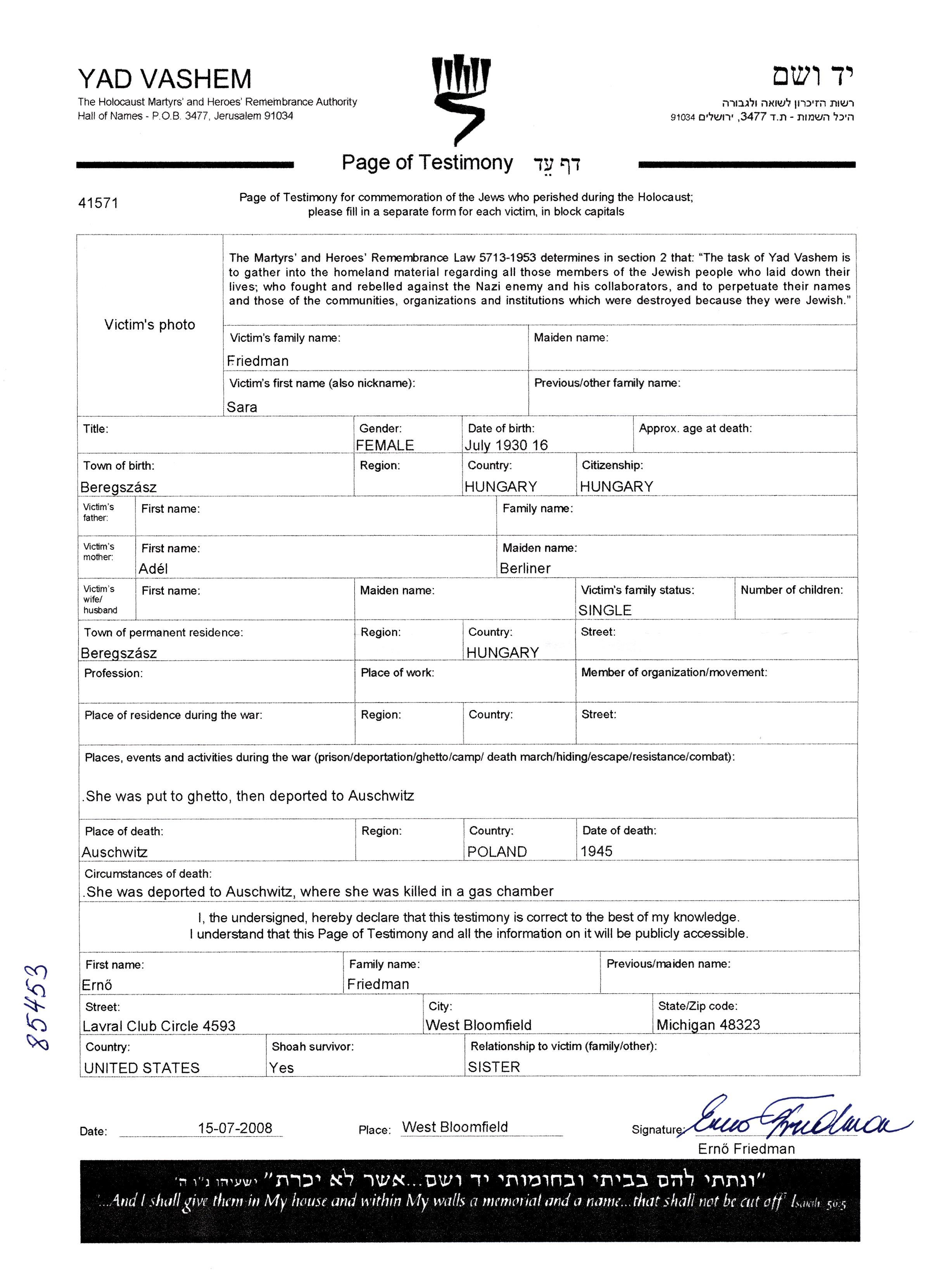 | Friedman | Sara | 1930 | Beregszasz, Czechoslovakia | Page of Testimony (digital signed) |