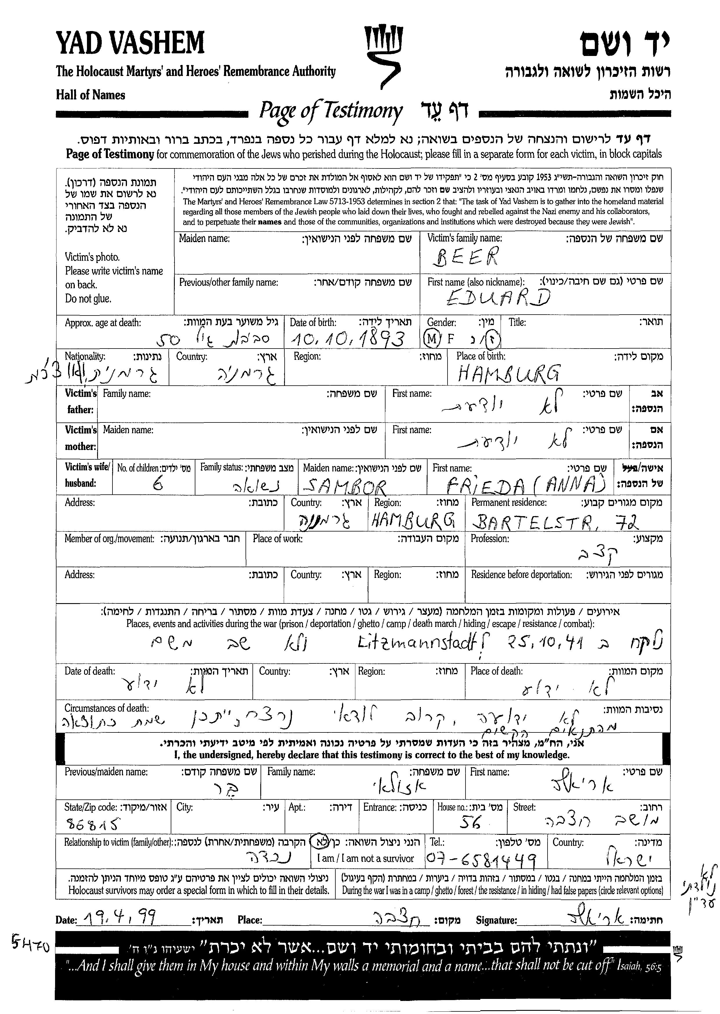 Eduard Beer was born in Hamburg, Germany, 1893. He was a butcher. Prior to WWII he lived in Hamburg, Germany.