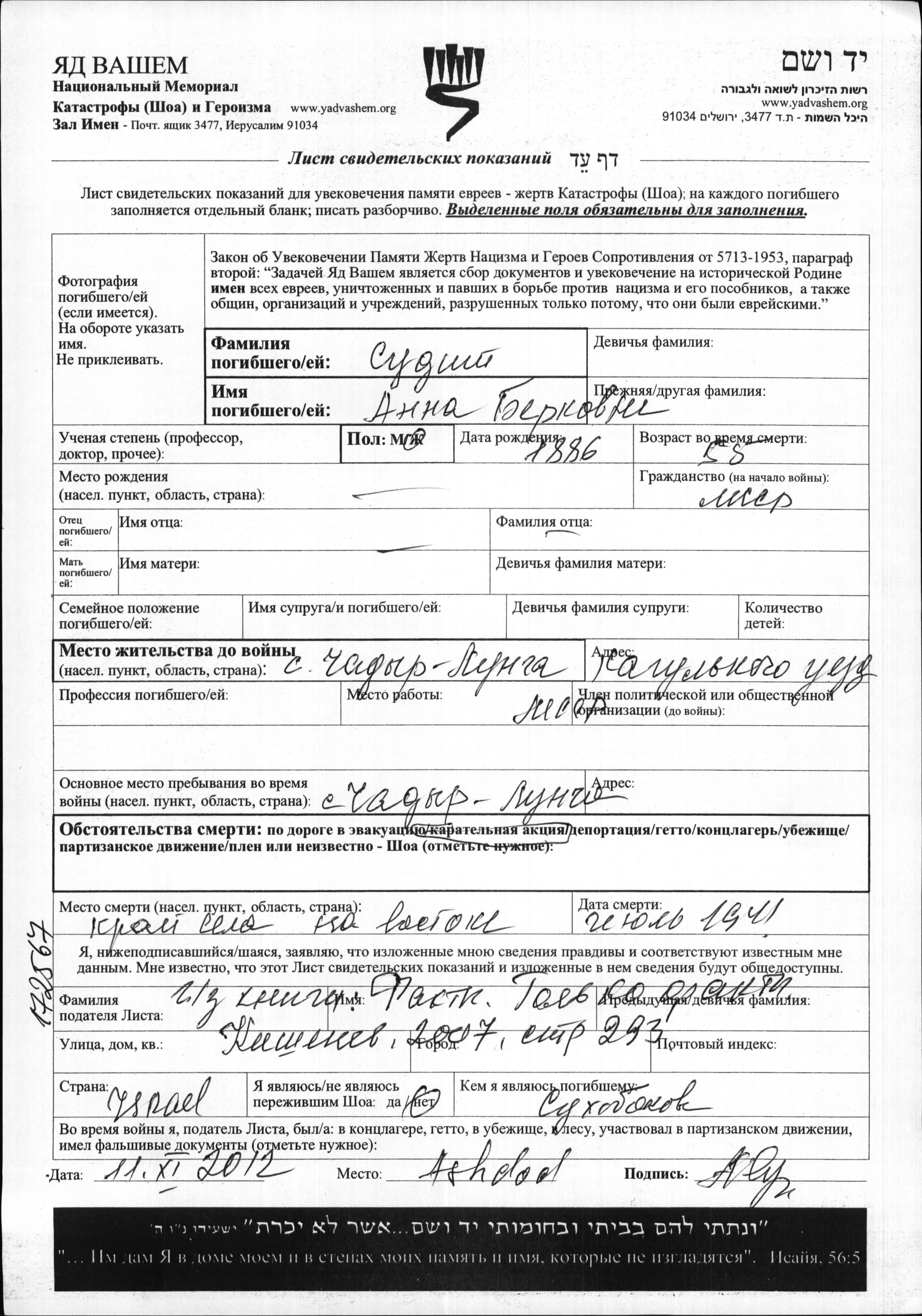 Anna was murdered in the Shoah. Place of death: unstated place, 1941.