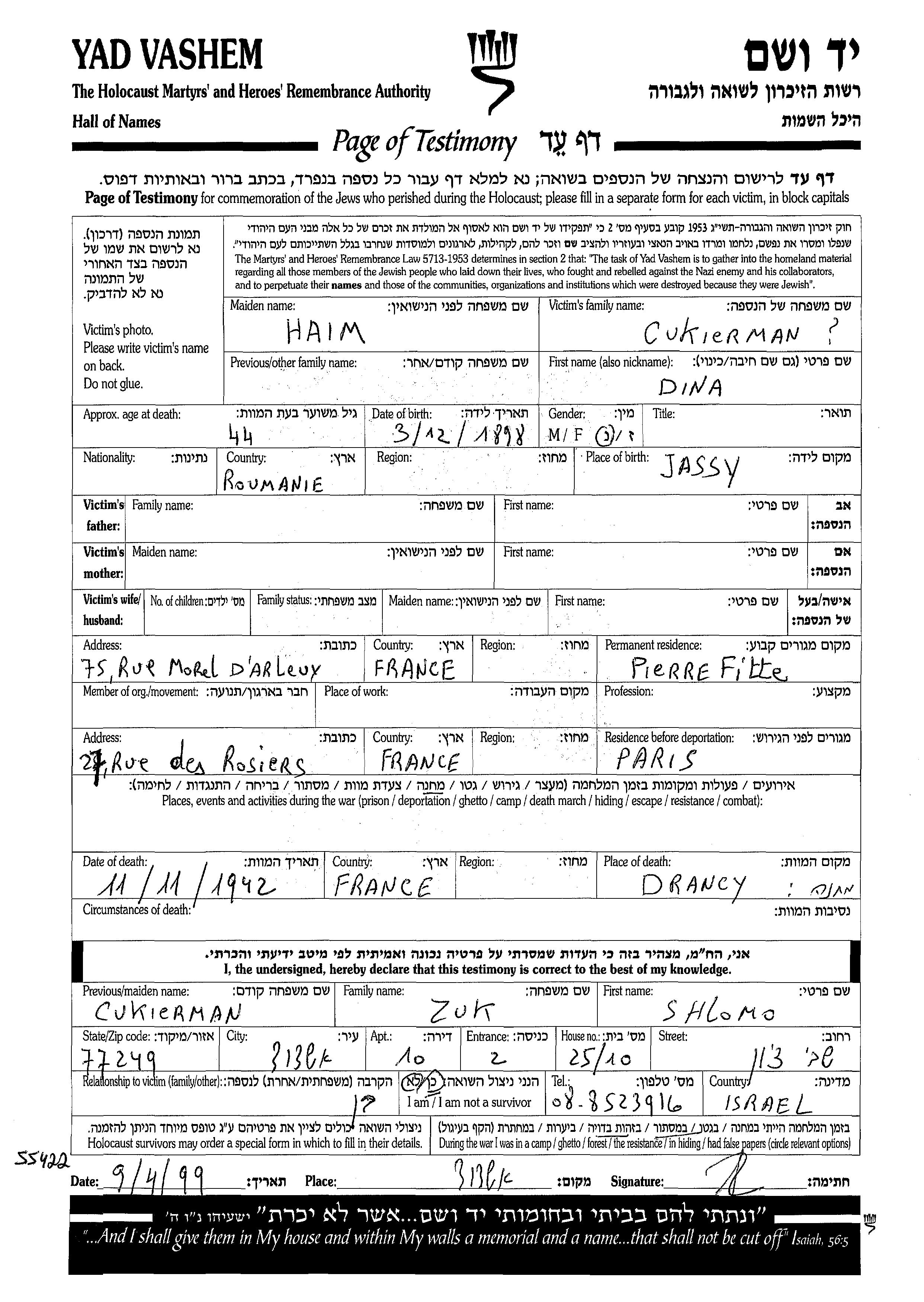 Cukierman Dina 1898 Pierrefitte sur Seine, France Page of Testimony