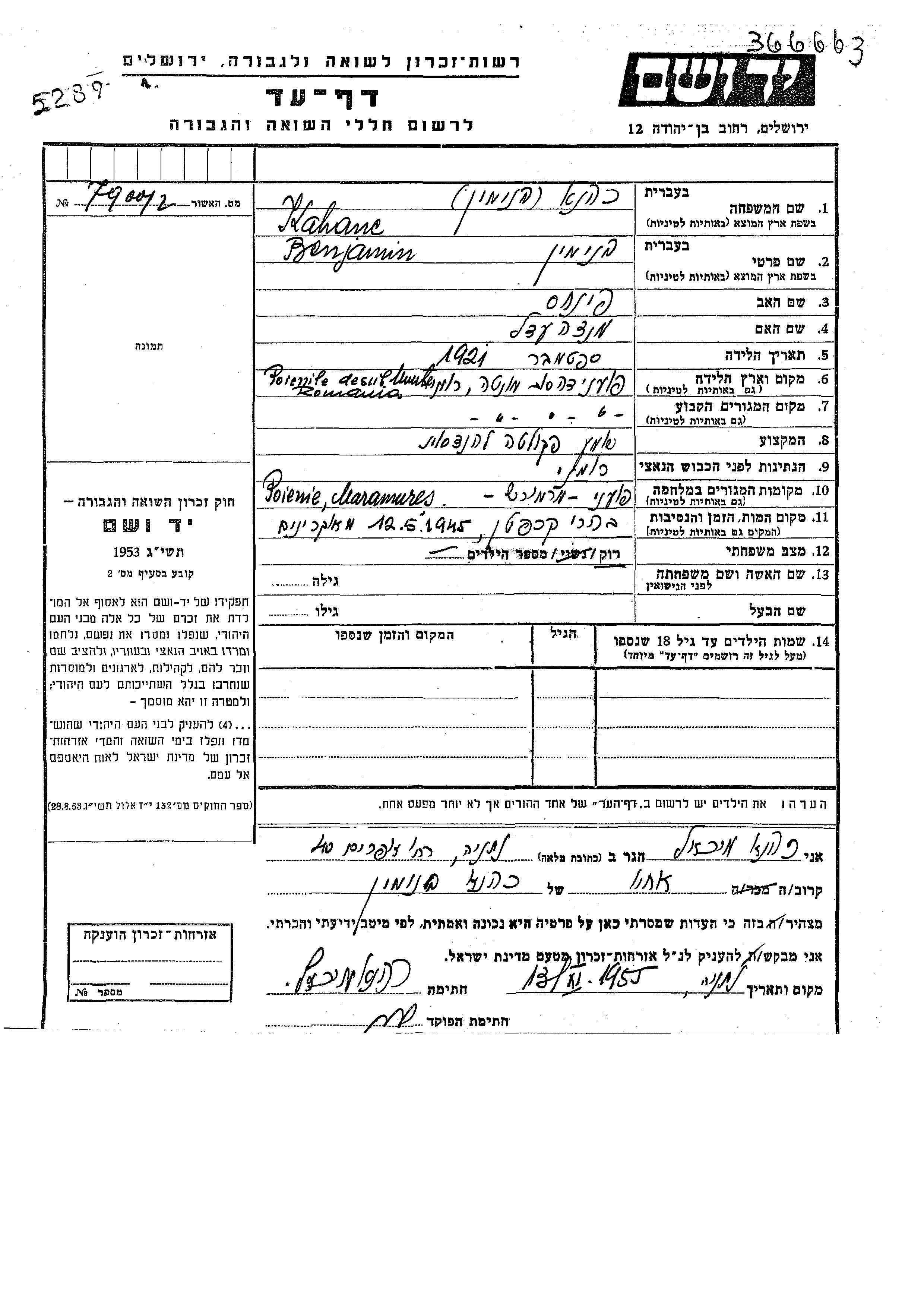 | Kahane | Benjamin | 1921 | Poienile de sub Munte, Romania | Page of Testimony |