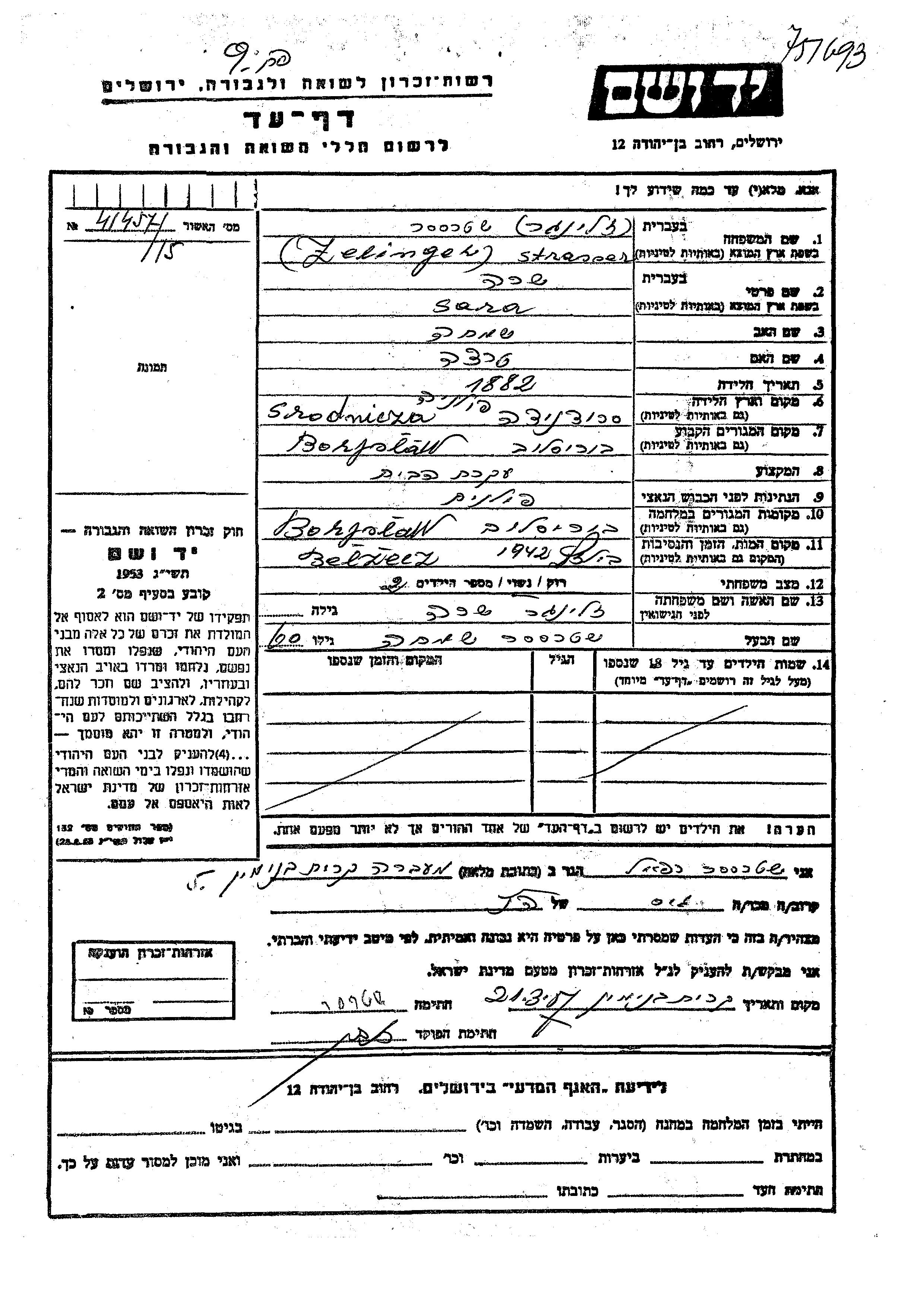 Sara Strasser nee Zelinger was born in Srodnicza, Poland, 1882 to Simkha and Tertza. She was a housewife and married to Simkha. Prior to WWII she lived in Boryslaw, Poland. During the war she was in Boryslaw, Poland. Sara was murdered in the Shoah. Place of death: Belzec, Poland, 1942.