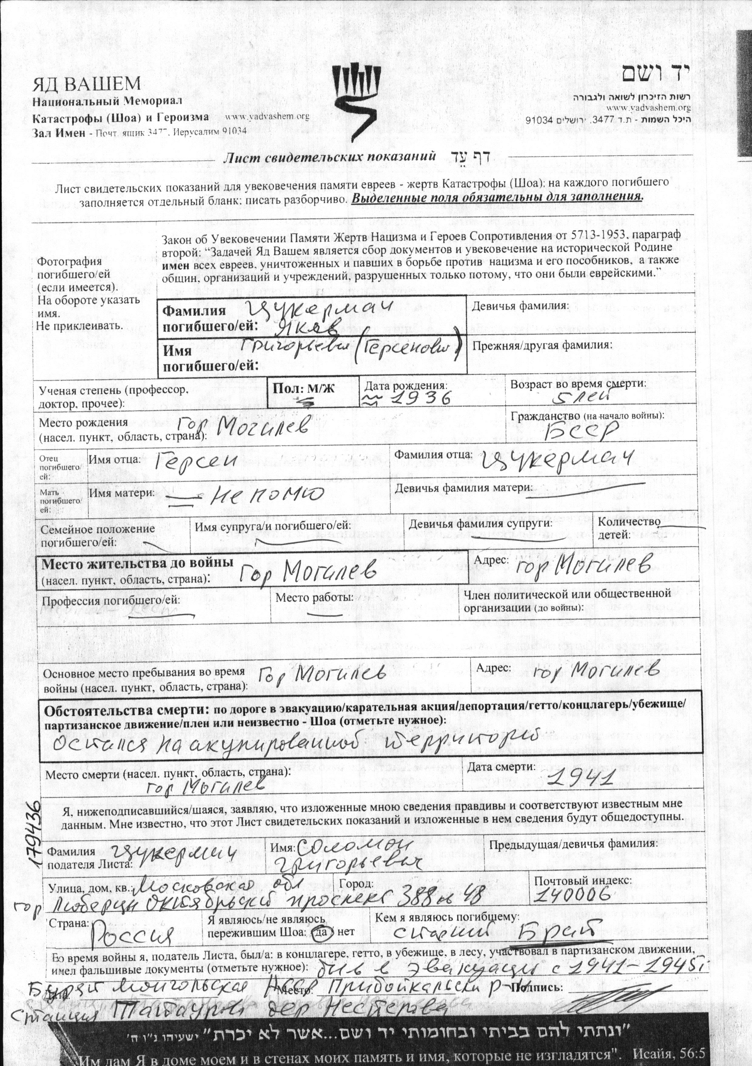 Tzukerman Yakov 1936 Mogilev, Belorussia (USSR) Page of Testimony