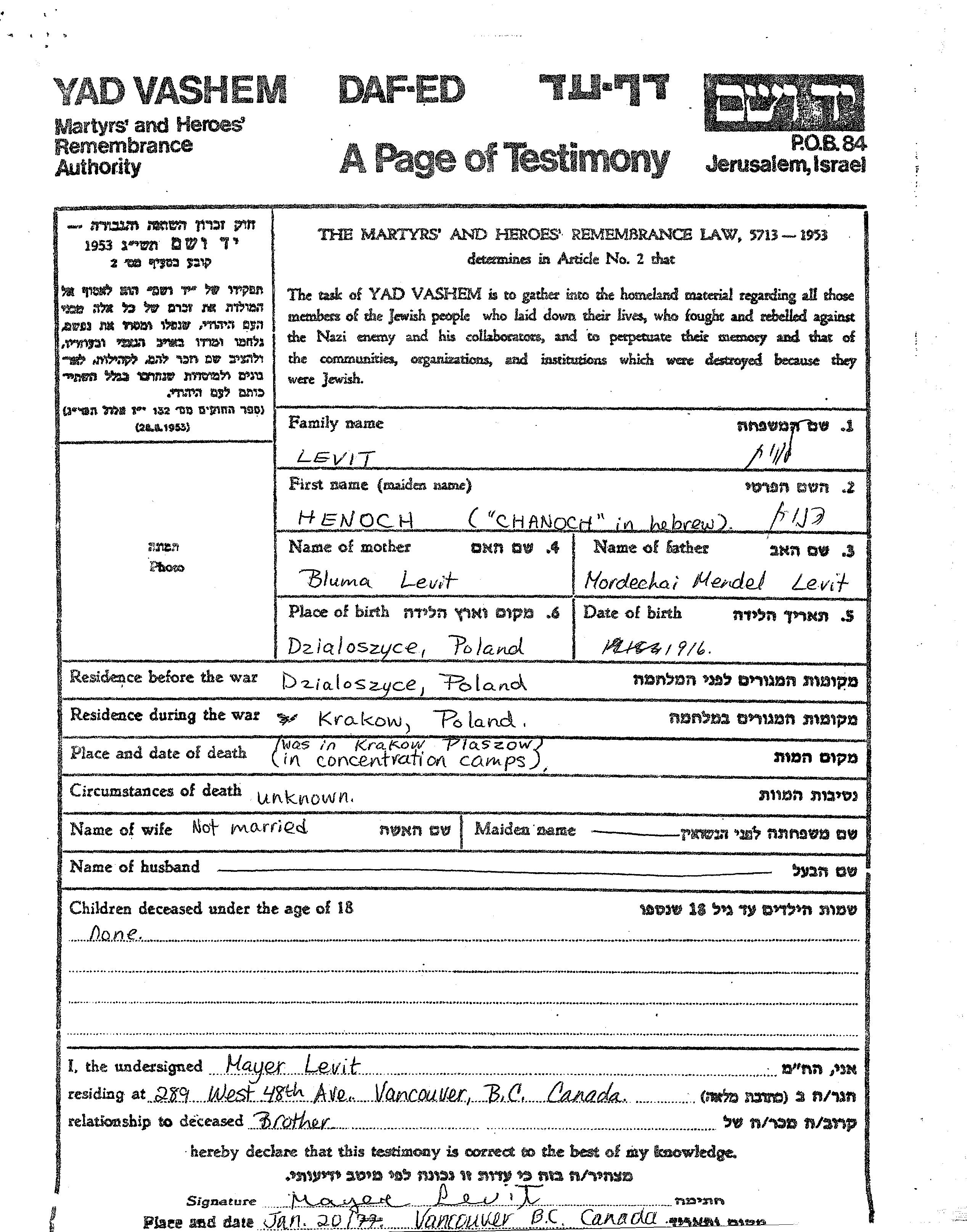 Levit Chanoch Dzialoszyce, Poland Page of Testimony