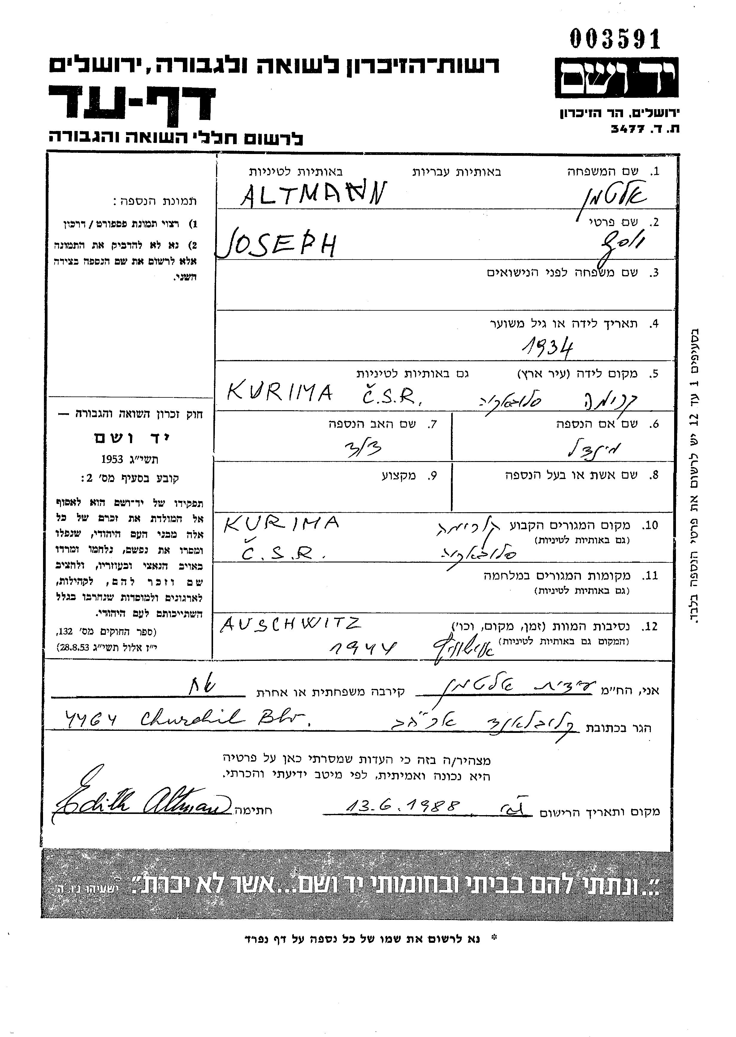 | Altman | Yosef | Kurima, Czechoslovakia | Page of Testimony |