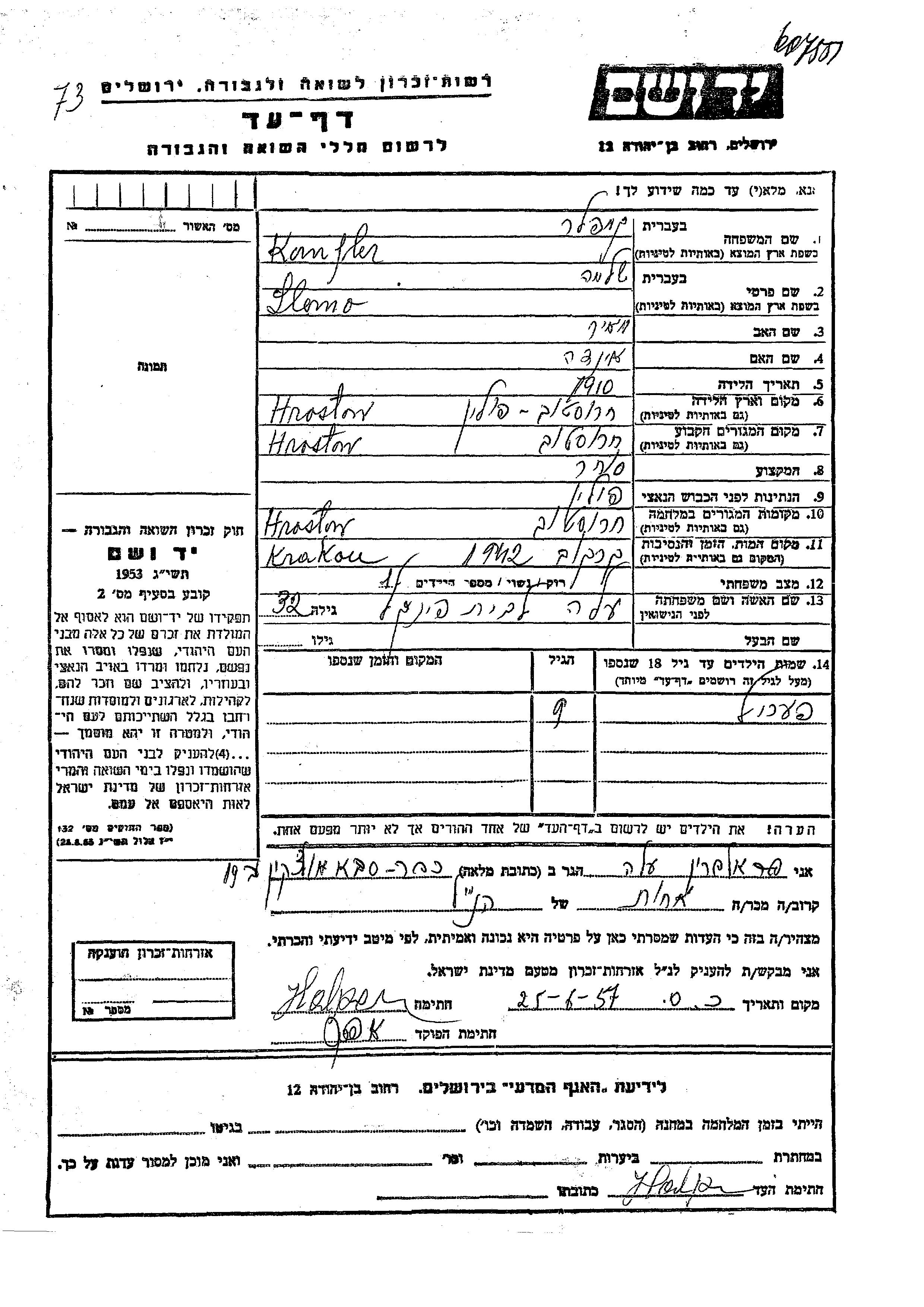 Slomo Kampler was born in Chrostowa, Poland, 1910 to Meir and Inda. He was a merchant and married to Ela nee Finkel. Prior to WWII he lived in Chrostowa, Poland. During the war he was in Chrostowa, Poland. Slomo was murdered in the Shoah. Place of death: Krakow, Poland, 1942.