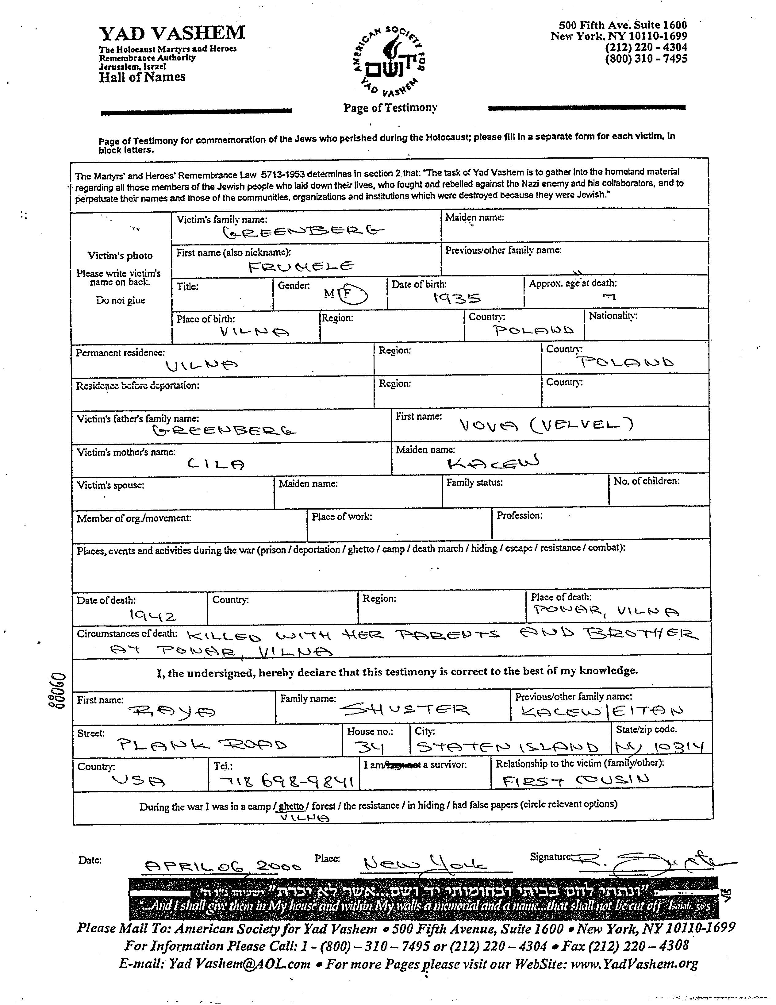 Fruma Greenberg was born in Wilno, Poland. Prior to WWII she lived in Wilno, Poland.
