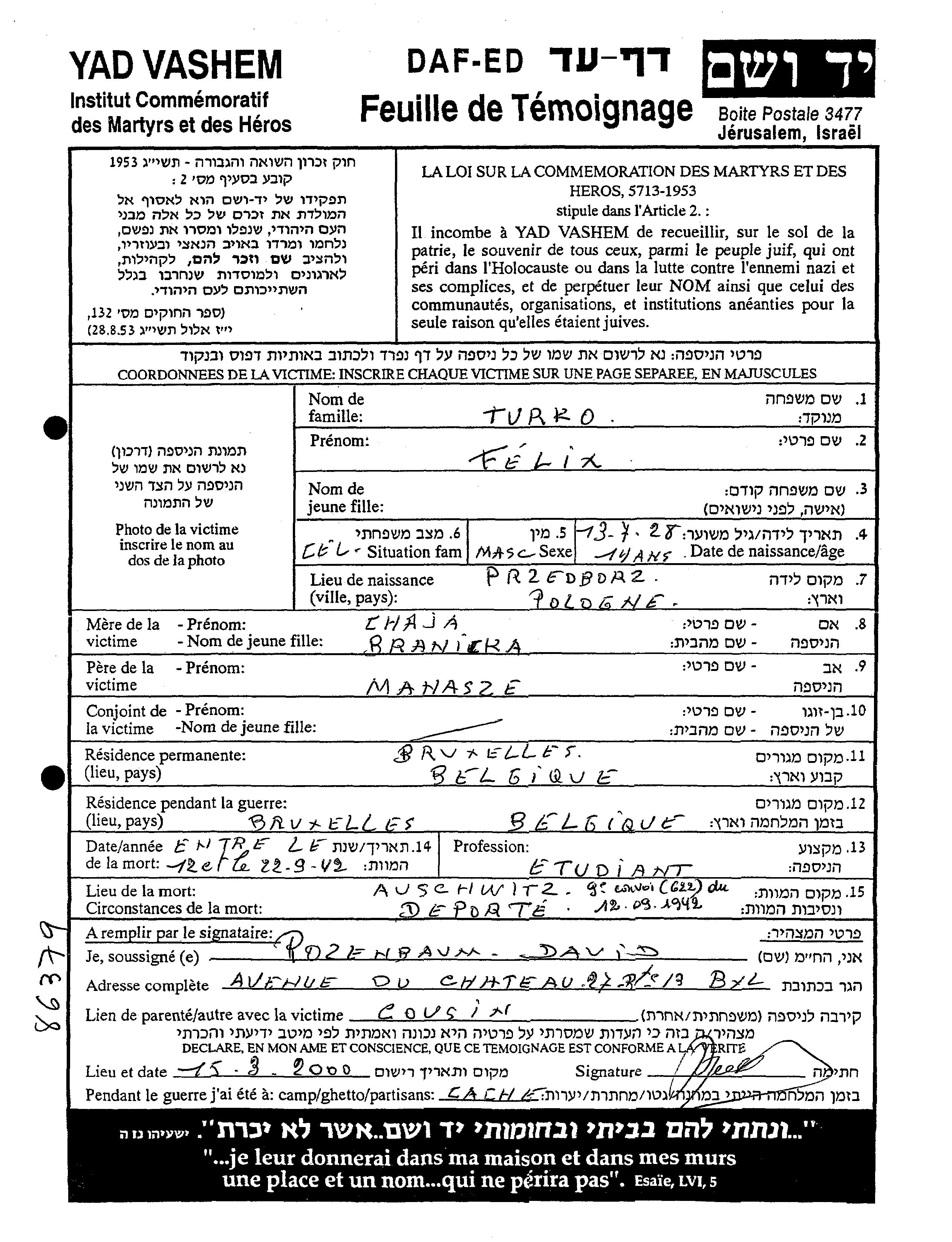 Turko | Felix | 1928 | Bruxelles, Belgium | Page of Testimony |