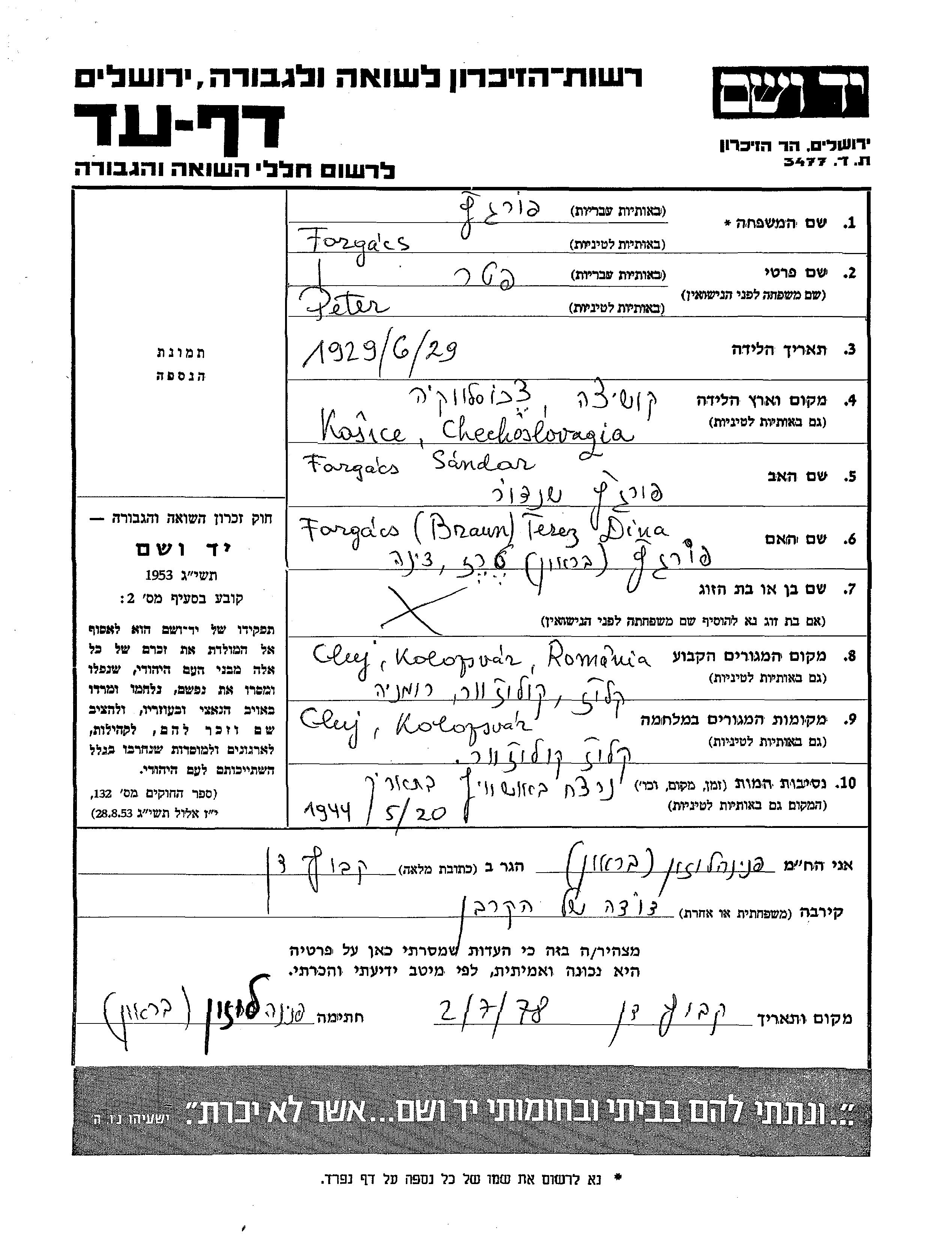 Forgacs | Peter | 1929 | Cluj, Romania | Page of Testimony |
