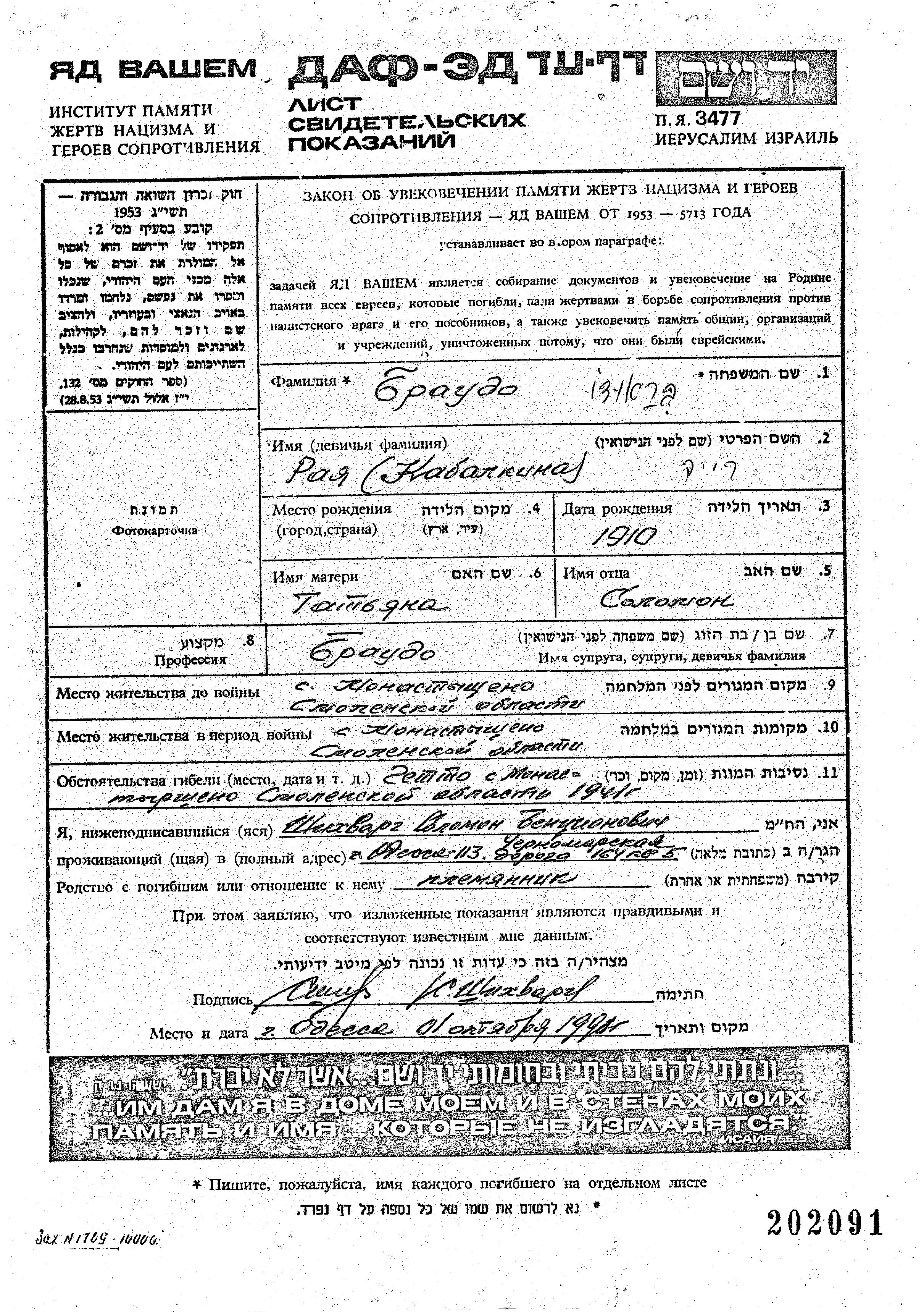 Raya Braudo nee Kabalkin was born, 1910. Prior to WWII she lived in Monastyrshchina, Russia (USSR). Raya was murdered in the Shoah. Place of death: Monastyrshchina, Russia (USSR), 1941.