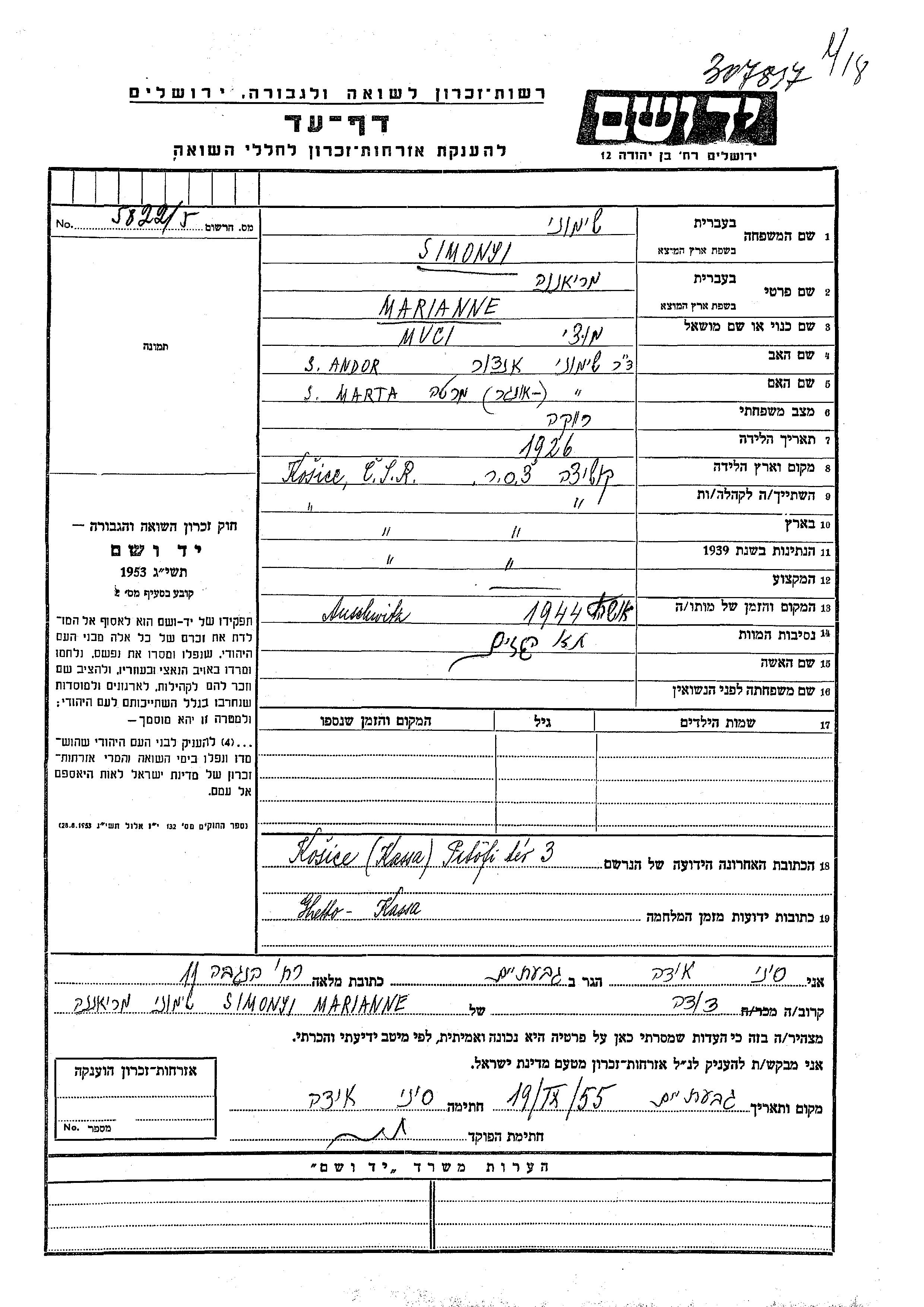 Simonyi | Marianne | Kosice, Czechoslovakia | Page of Testimony |