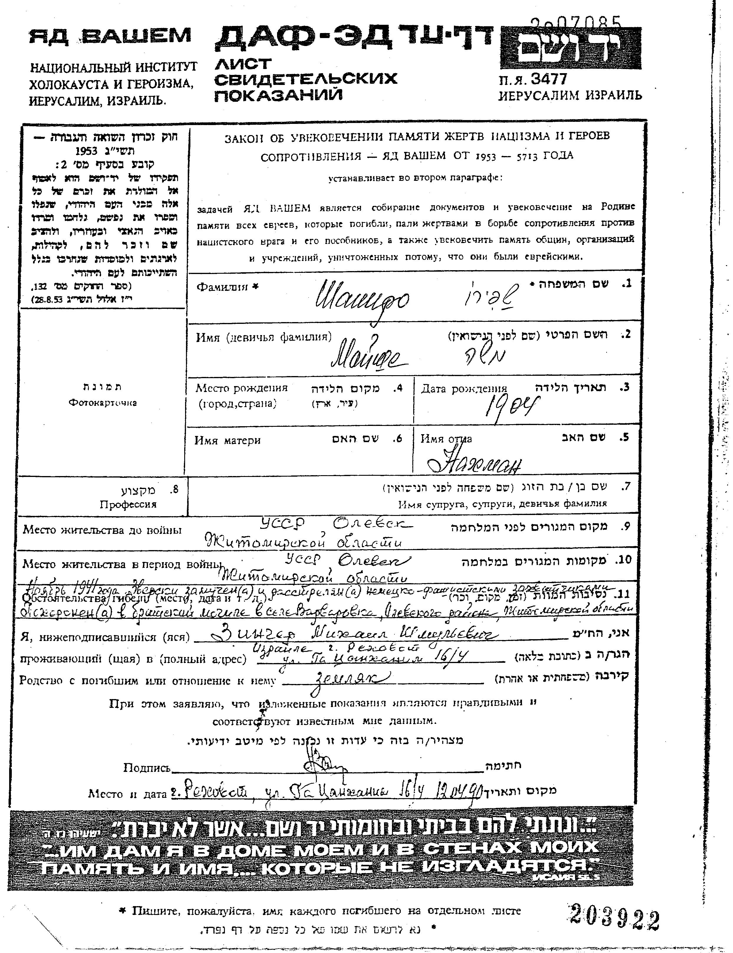Shapiro | Moishe | 1904 | Olevsk, Ukraine (USSR) | Page of Testimony |