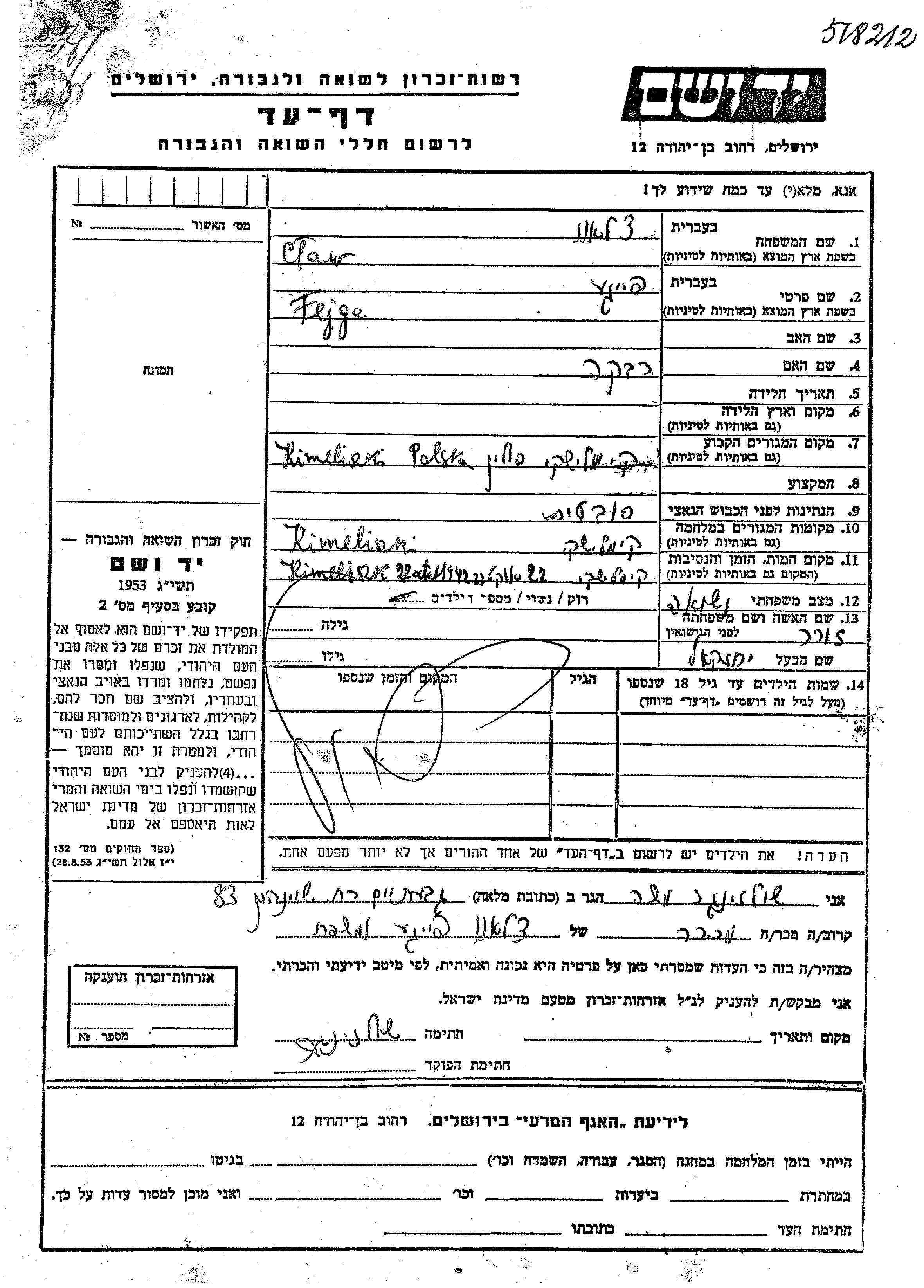 Feige Claw nee Zhurer Khadash was born in Kiemieliszki, Poland, 1900. Prior to WWII she lived in Kiemieliszki, Poland. Feige was murdered in the Shoah. Place of death: unstated place, 22/10/1942.