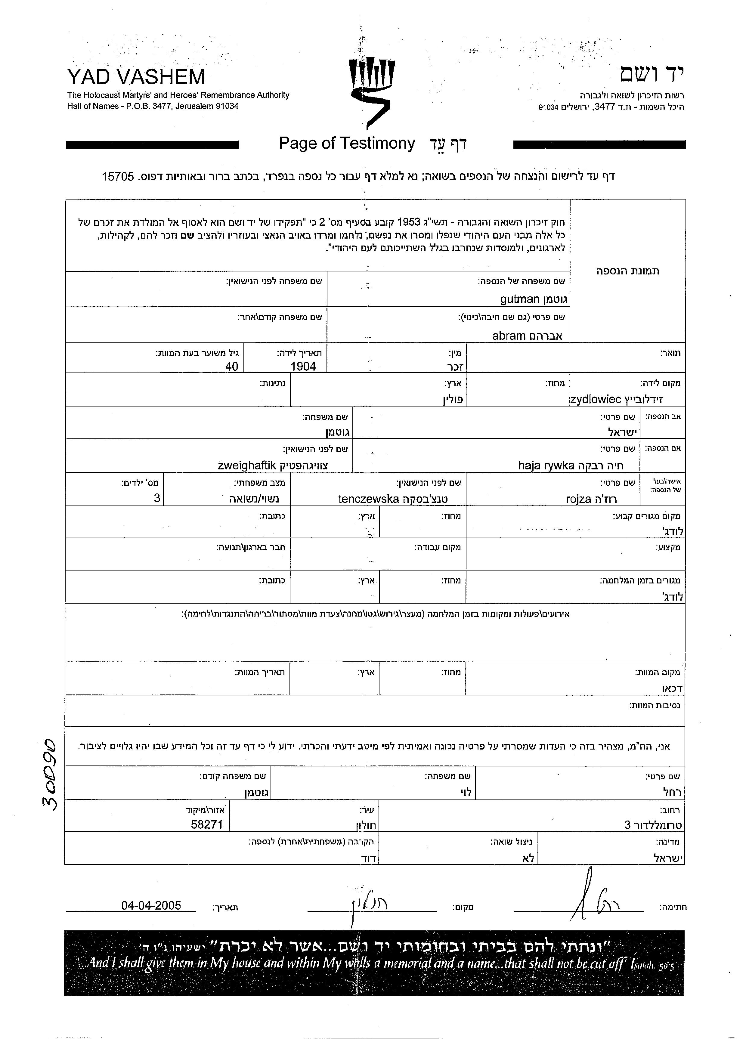 Gotman Gutman Abram 1904 Lodz, Poland Page of Testimony (digital signed)
